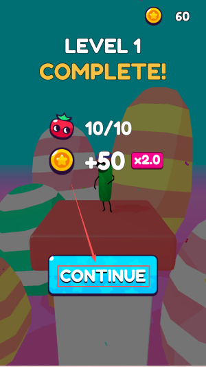 4、最后,领取奖励“+50×2.0”,点击“CONTINUE”进入下一关挑战更高得分。