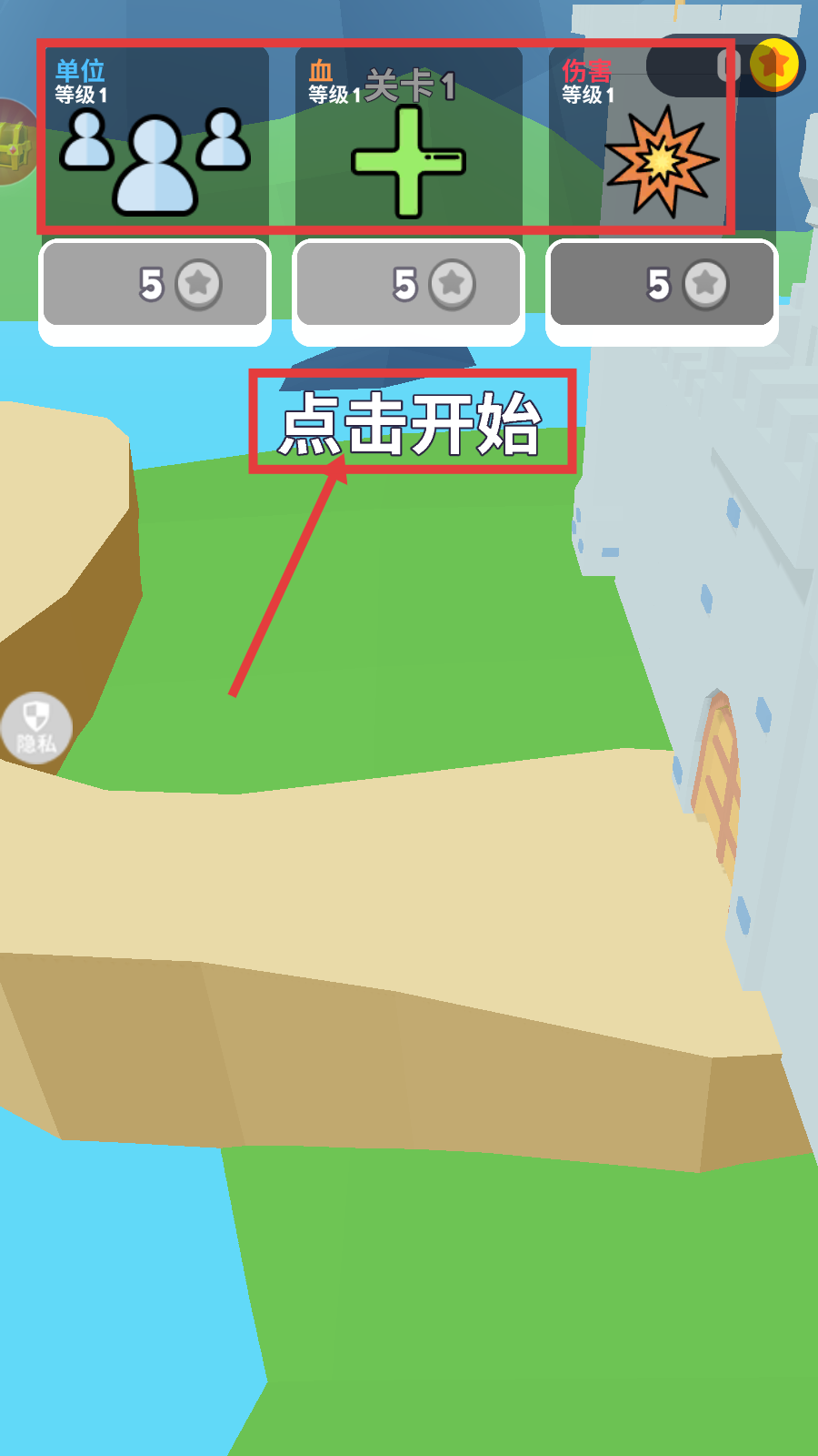 1、进入游戏后,确认【单位-等级1】【血-等级1关卡1】【伤害-等级1】均为5星,点击【点击开始】开启关卡1冒险。