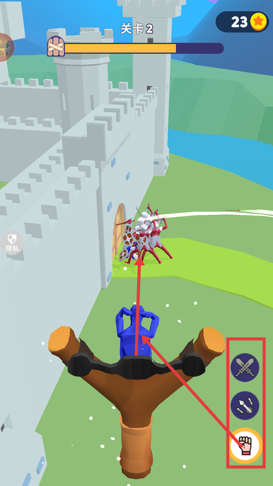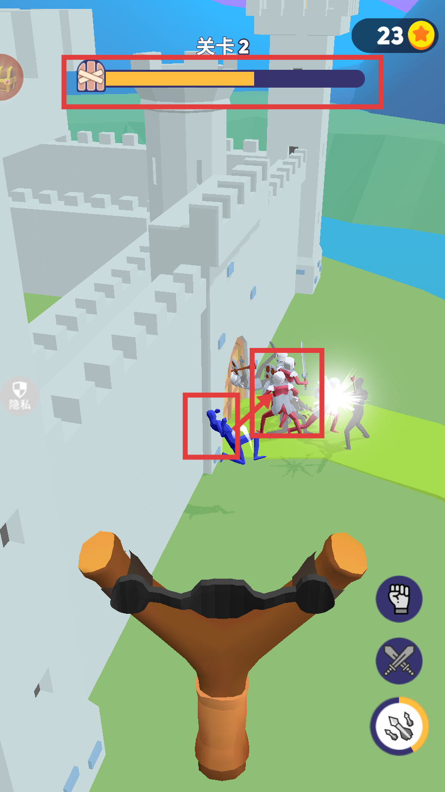 2、在关卡2中,使用弹弓发射蓝色单位,可根据战况选择右侧【拳头】等武器图标,精准瞄准敌方单位发起攻击。
