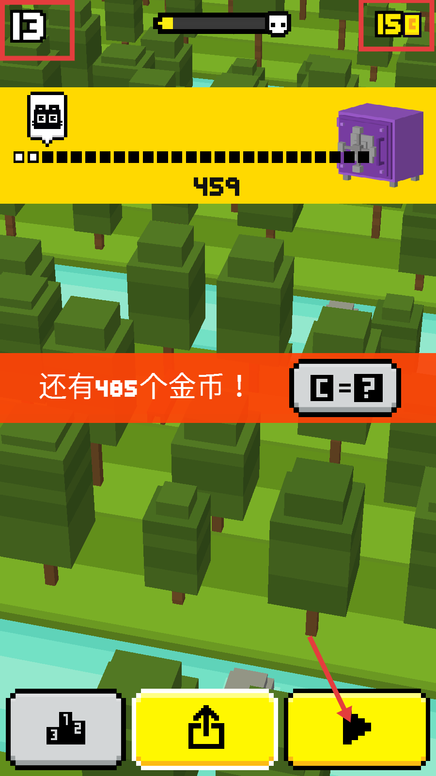 4、关注关卡13和金币150,收集剩余485个金币,点击箭头按钮继续挑战,争取更多奖励。