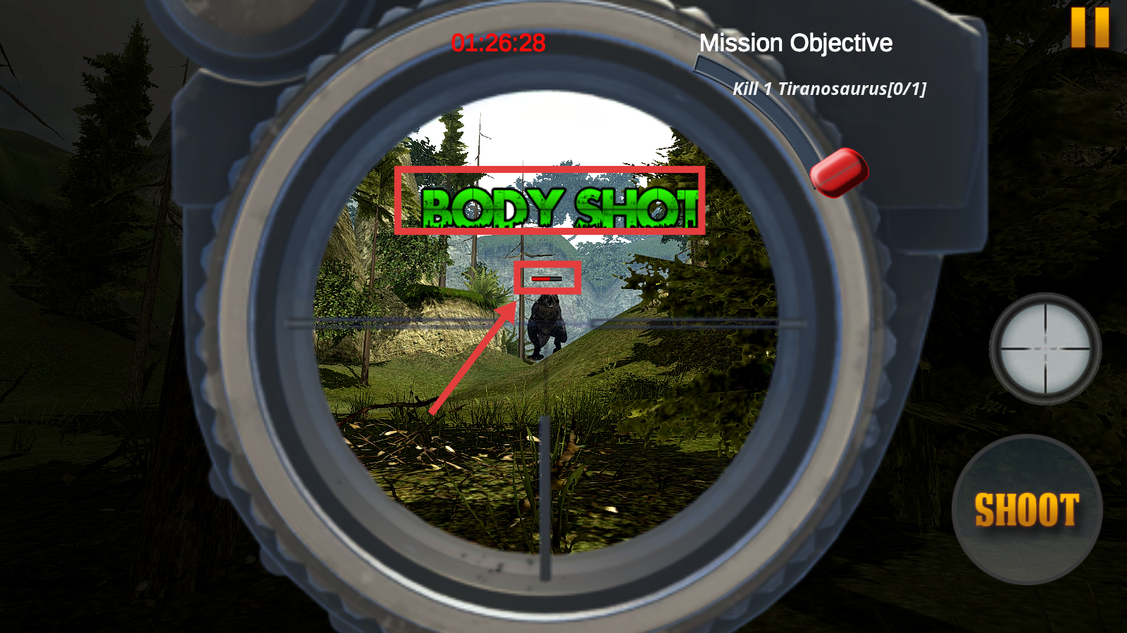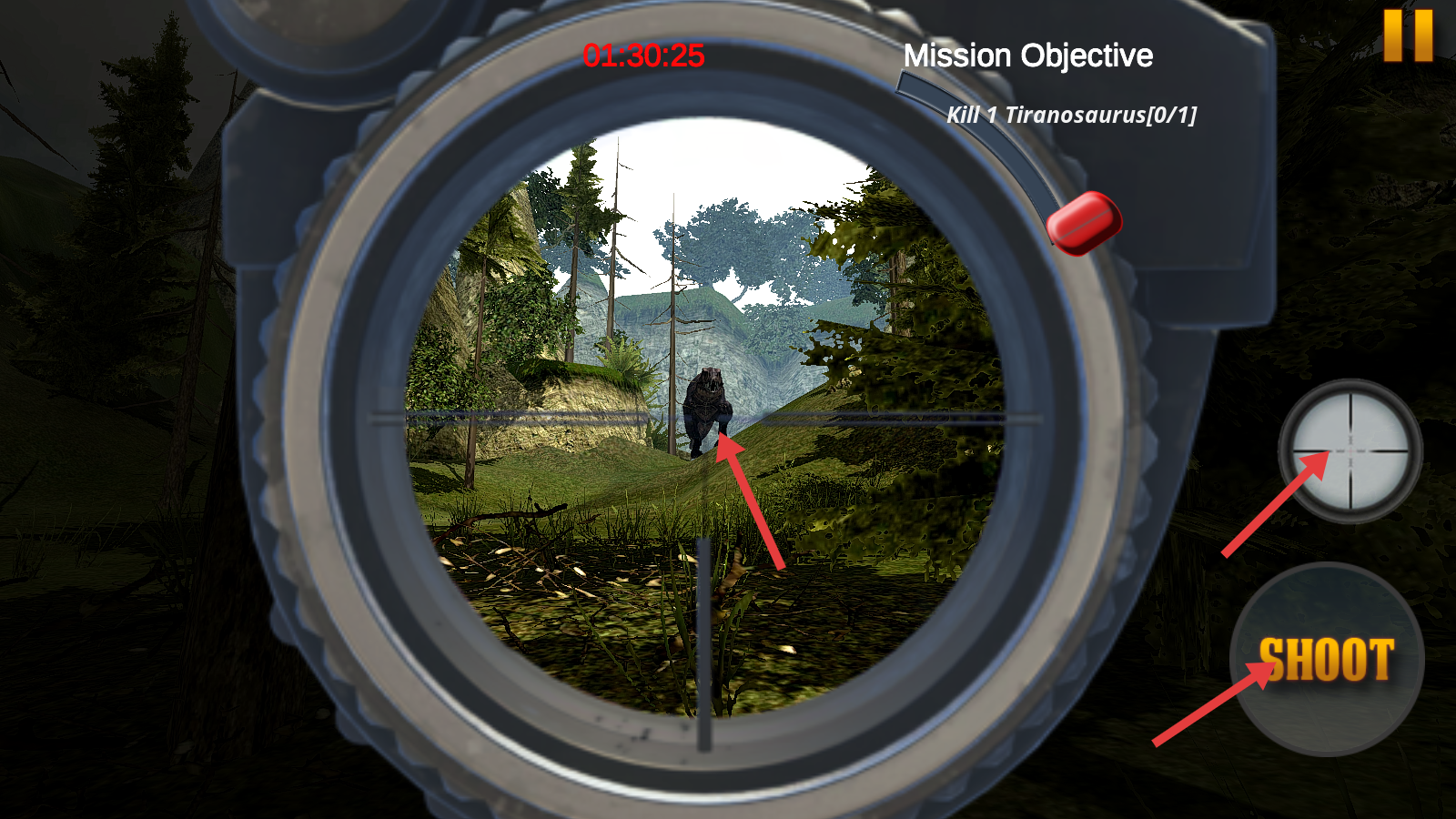 2、瞄准【Tiranosaurus】,调整瞄准镜,点击【SHOOT】按钮射击,注意任务时间和目标进度【0/1】。