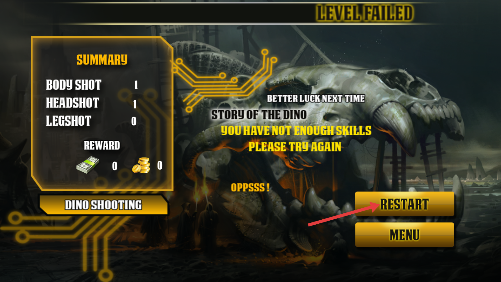 4、若任务失败,点击【RESTART】按钮重新开始,总结射击技巧,提升技能以完成恐龙击杀任务。