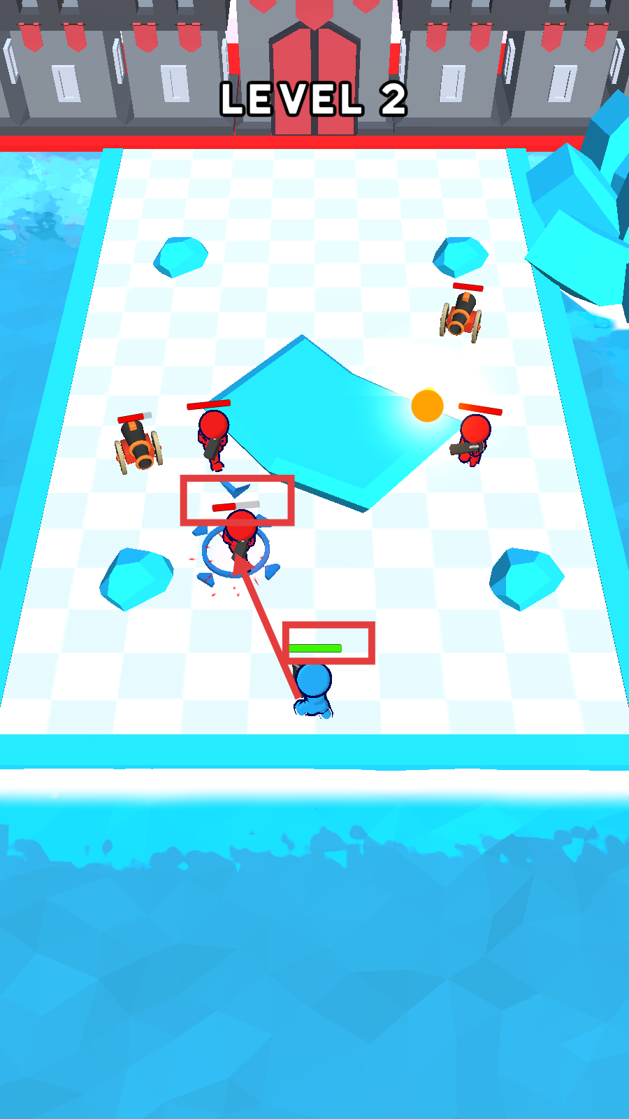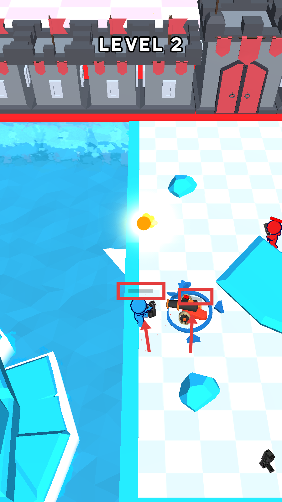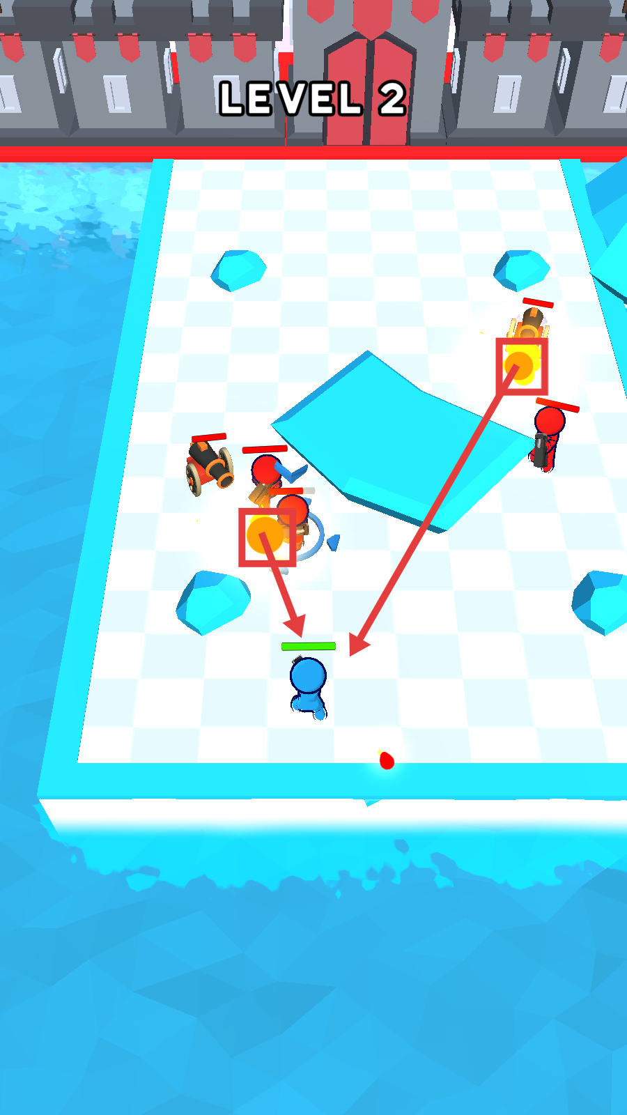 1、进入【LEVEL-2】,操控蓝色小人攻击红色目标,收集资源,开启战斗任务,尽量躲避炮弹攻击。