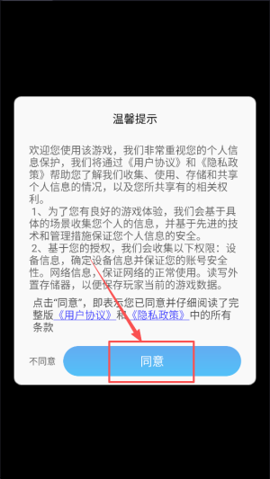 1、首先,阅读并同意用户协议和隐私政策,点击“同意”按钮以进入游戏。