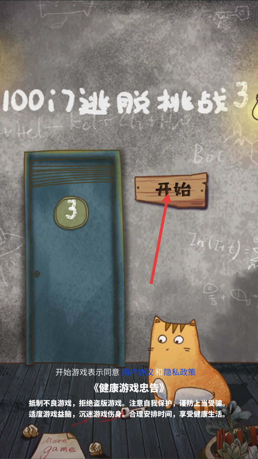 1、进入【100门逃脱挑战3】,点击【开始】按钮,同意用户协议和隐私政策后正式开启逃脱之旅。