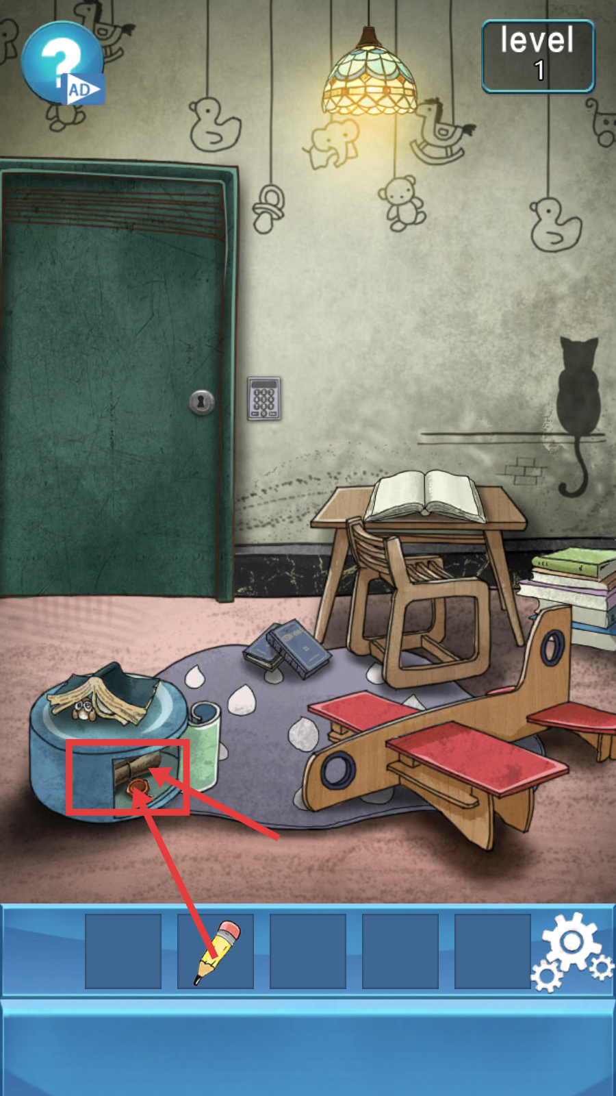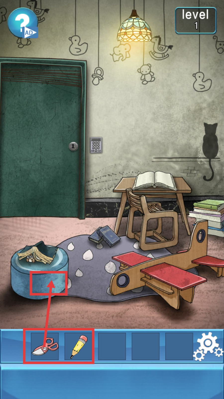 2、在level1场景中,先使用下方道具栏的【剪刀】,打开蓝色容器,获取关键道具以推进解谜。