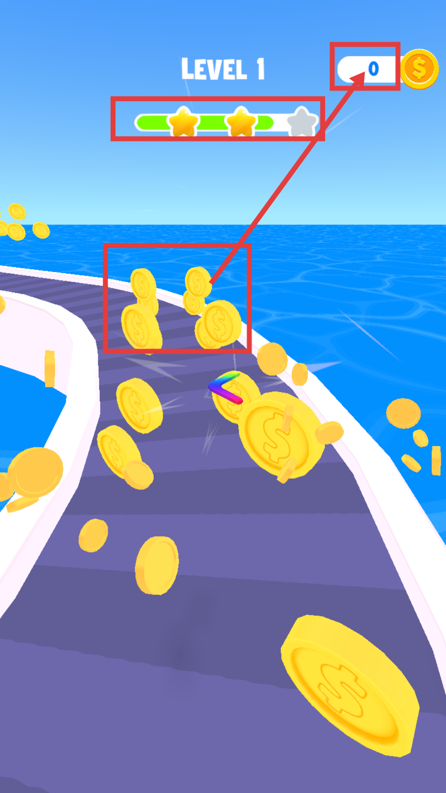 3、收集沿途【金币】,提升星级评价,同时增加金币数量,为通关积累财富。