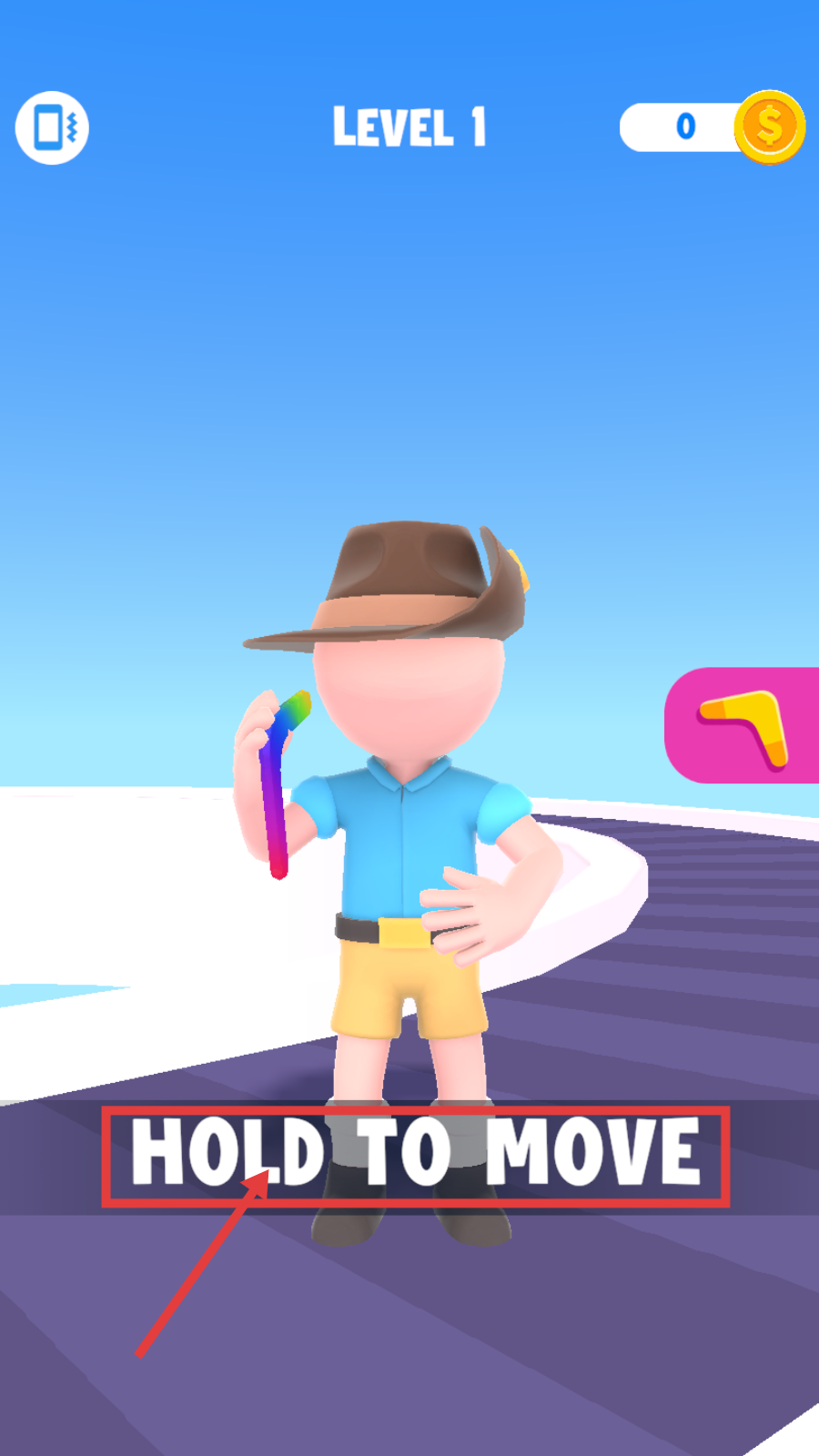 1、进入LEVEL1,按照【HOLD-TO-MOVE】提示,按住屏幕控制角色开始移动,开启关卡挑战。