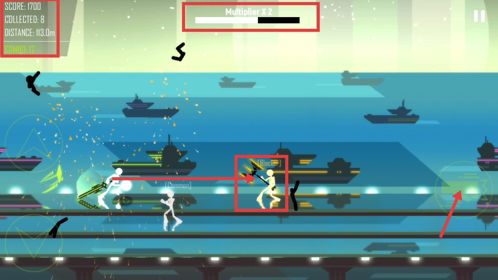 3、保持连击提升【Multiplier-X2】,应对【Blocker】等不同类型敌人,同时收集金币提升收益。