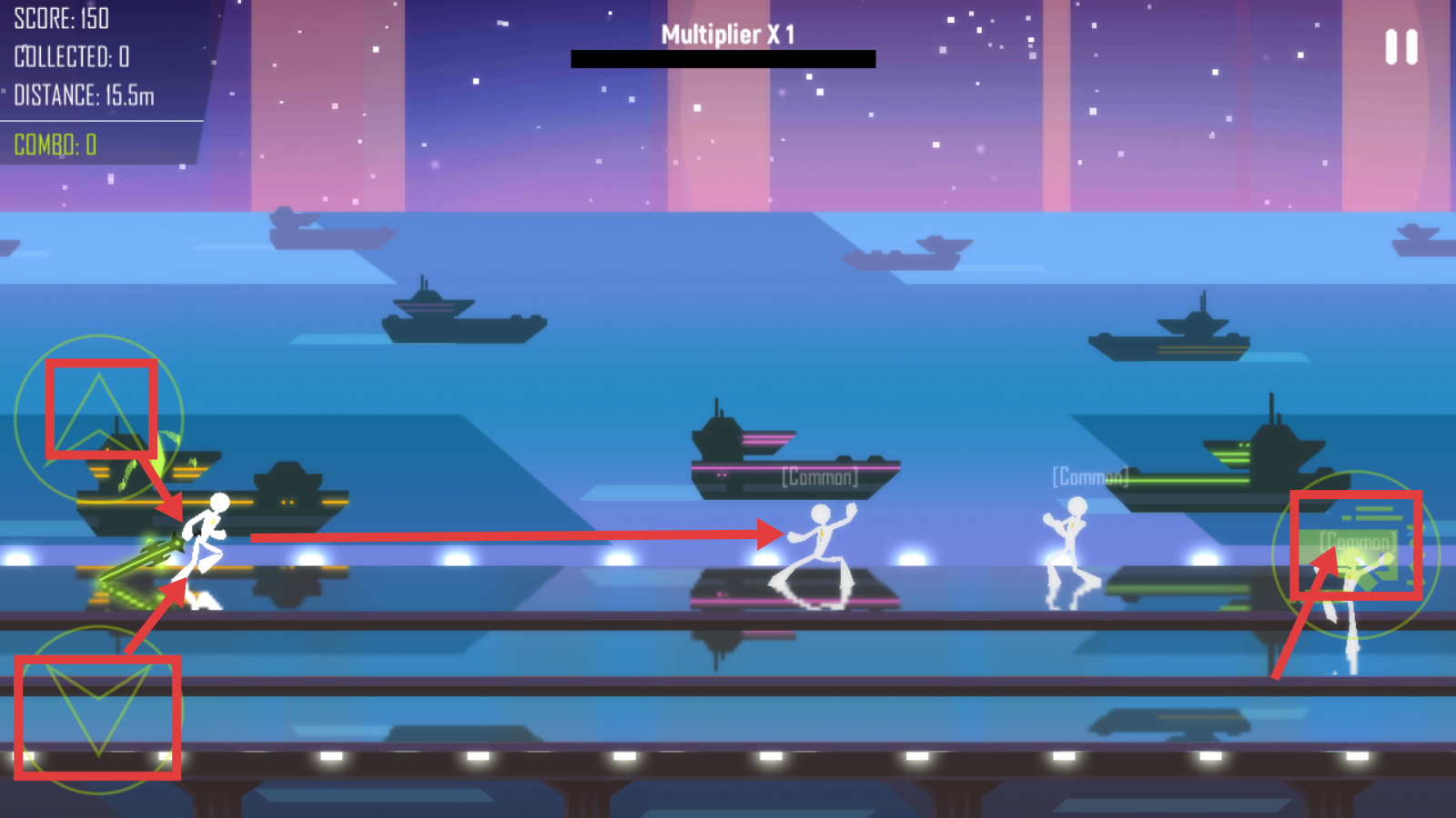 2、挑战中通过上下箭头控制角色移动,攻击【Common】敌人,积累分数和距离。