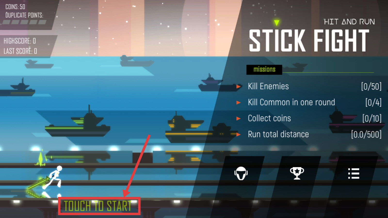 1、进入【Stick-Fight】游戏,点击【TOUCH-TO-START】,开启战斗跑酷挑战。