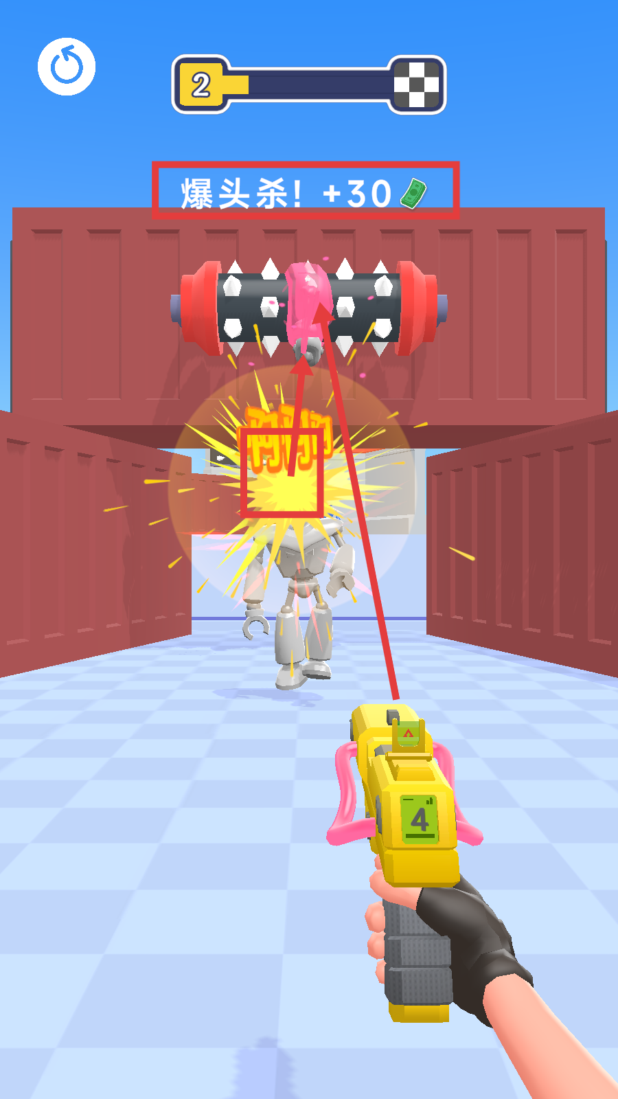 3、瞄准机器人头部,触发【爆头杀!+30】,获取高额奖励。