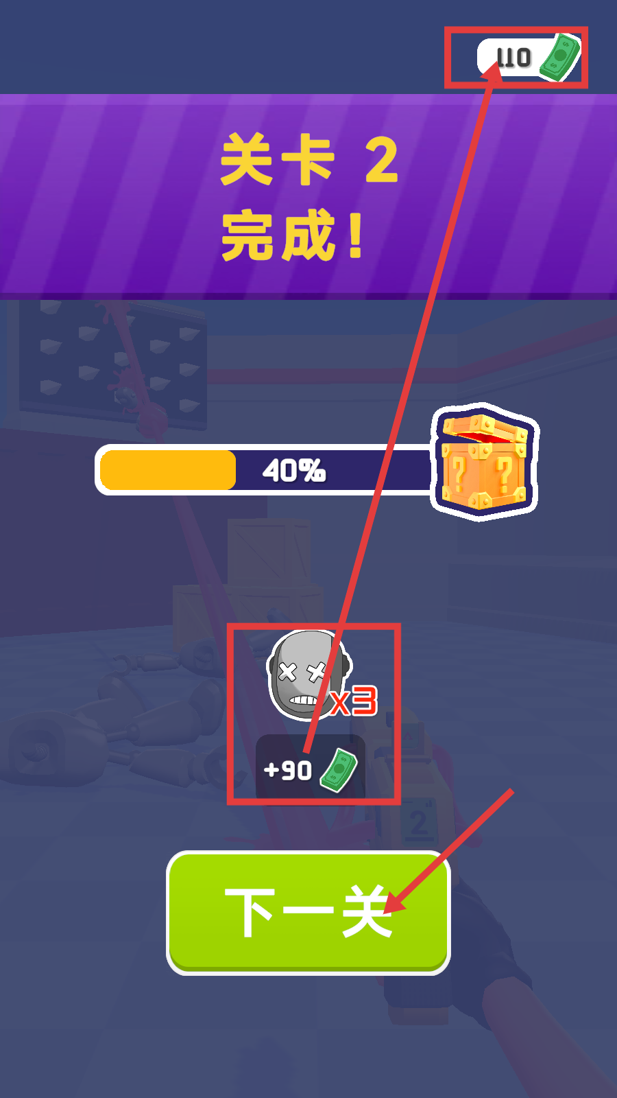 4、关卡2完成后,获得【110】货币,点击【下一关】继续挑战。