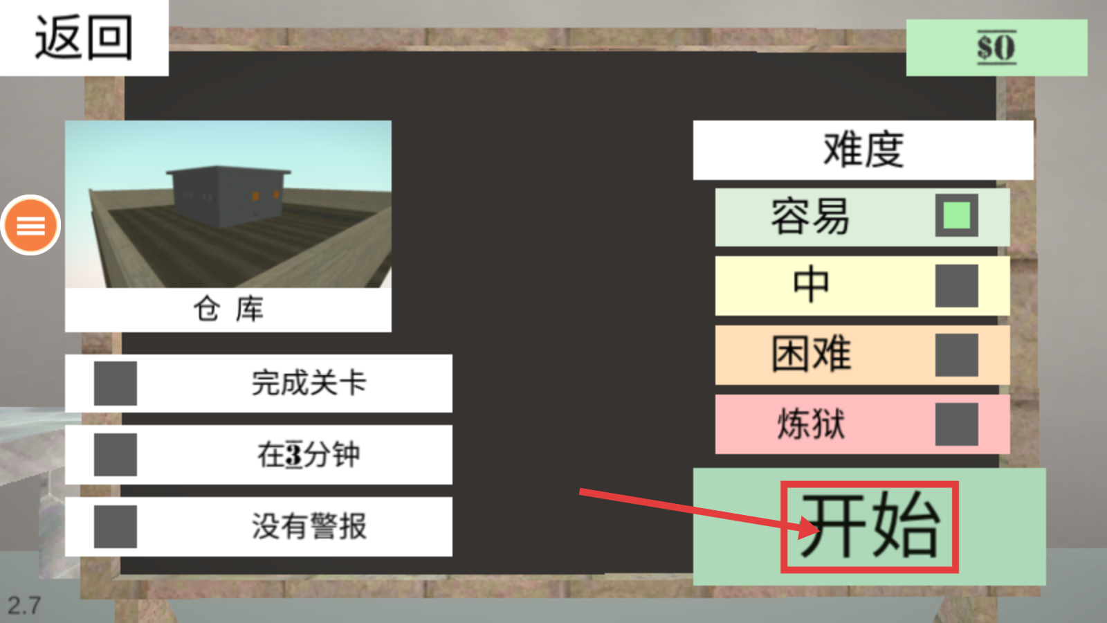 1、选择【仓库】关卡,难度选【容易】,点击【开始】按钮,进入战斗准备。