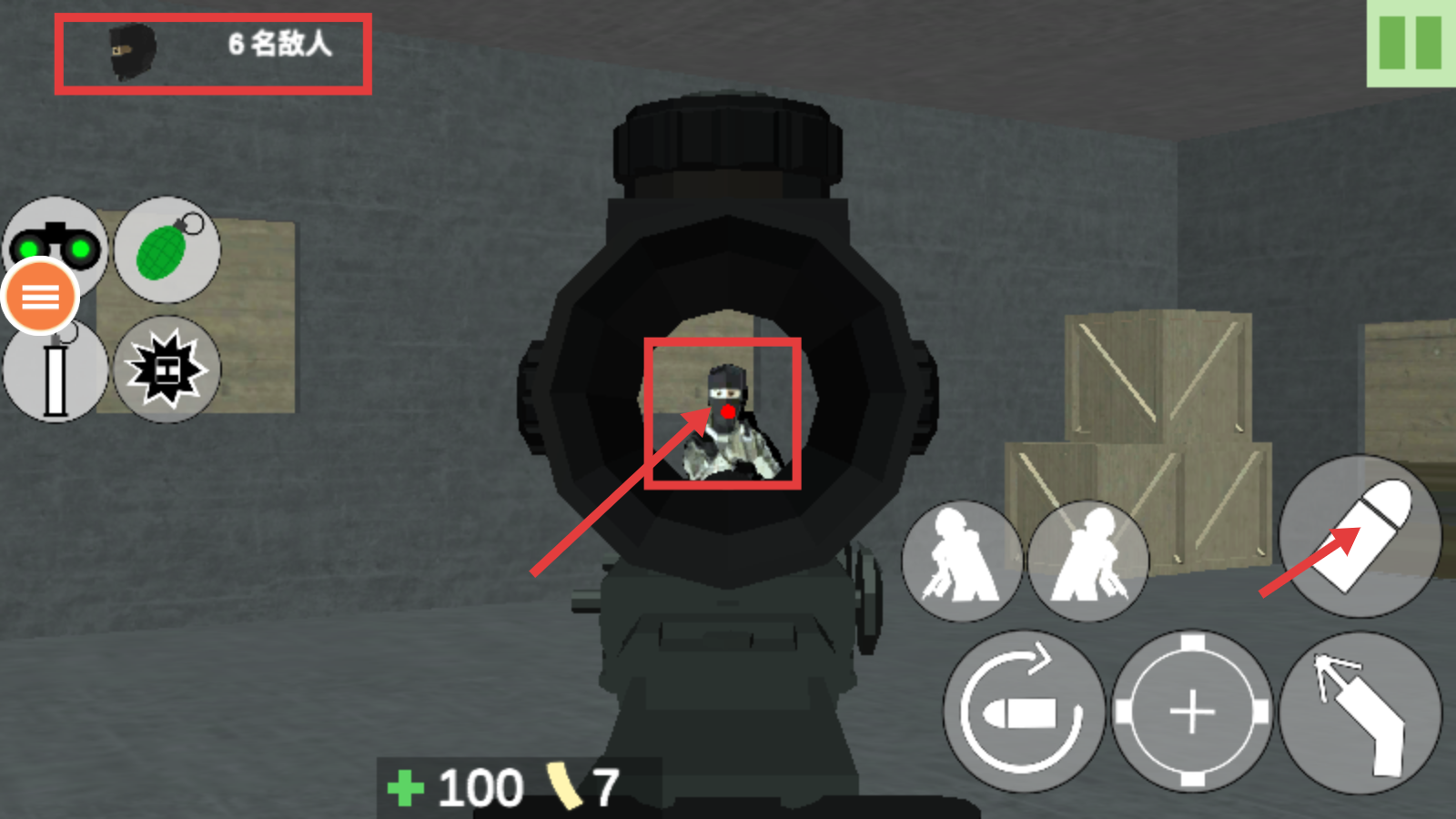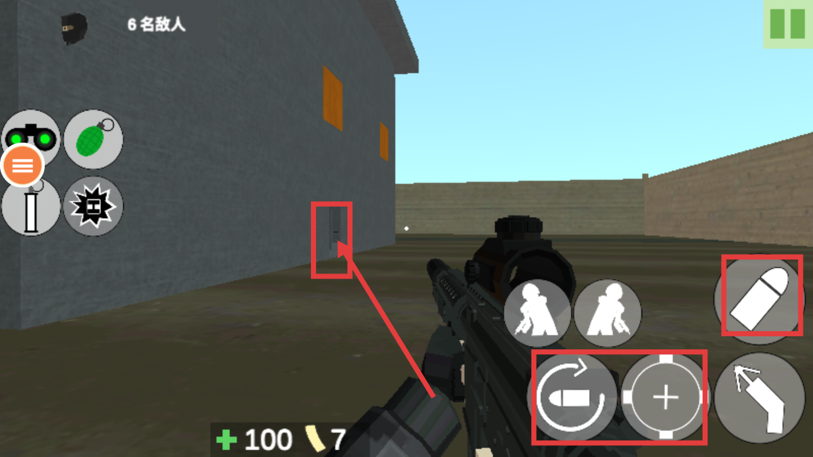2、进入关卡后,留意【6名敌人】提示,熟悉武器操作按钮,谨慎推进仓库入口。