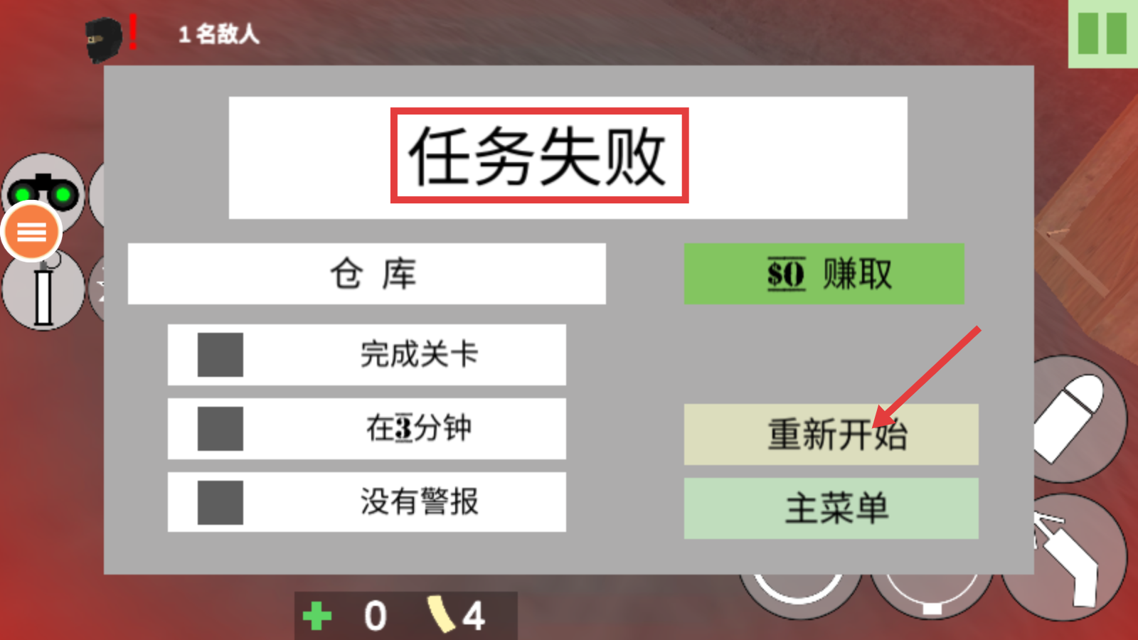 4、若任务失败,点击【重新开始】按钮,再次挑战仓库关卡,总结经验优化战斗策略。