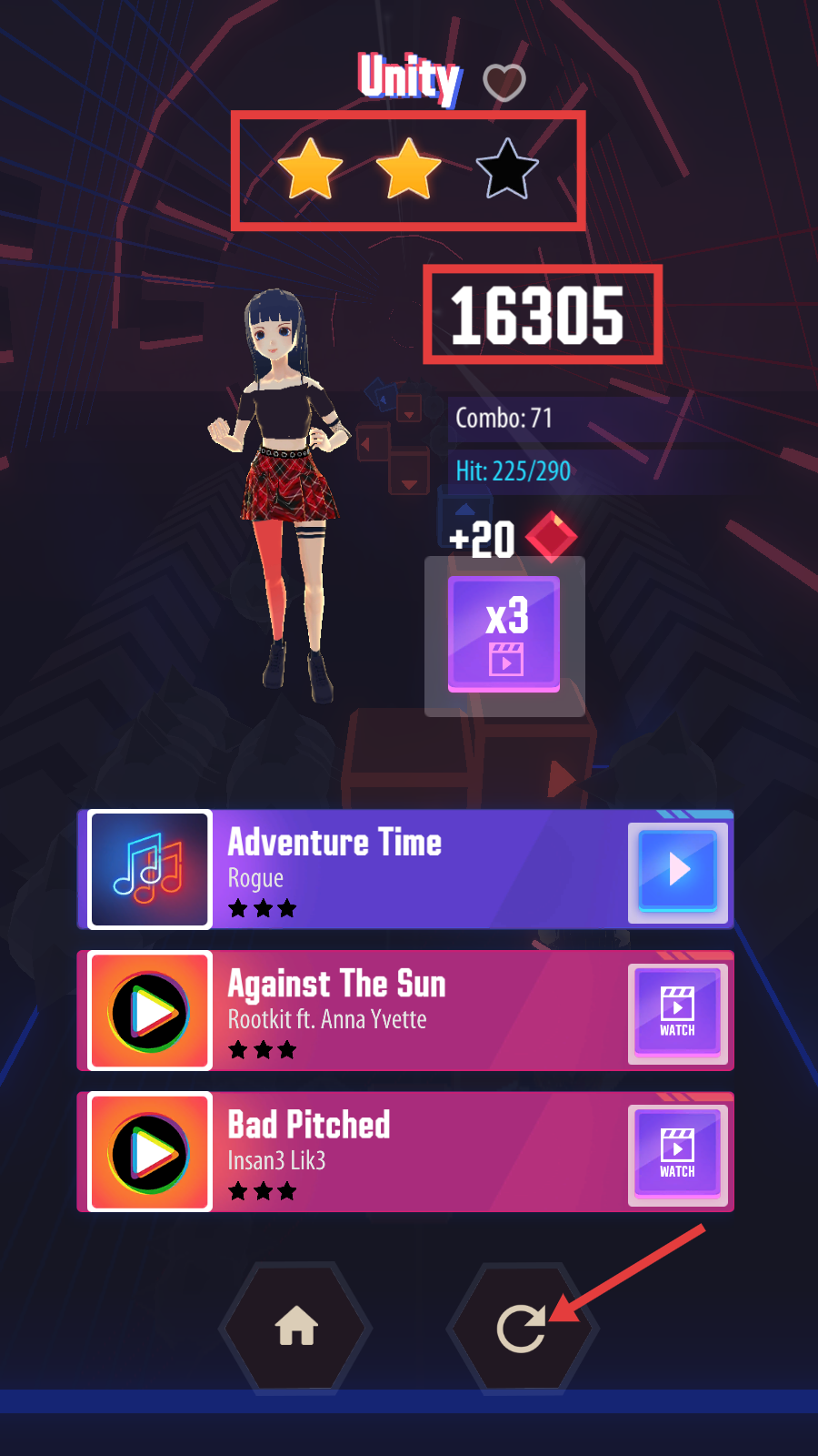 4、游戏结束后,可根据获得的星级和分数点击重玩按钮挑战高分,也可选择【Adventure-Time】等歌曲继续游玩,丰富音乐体验。