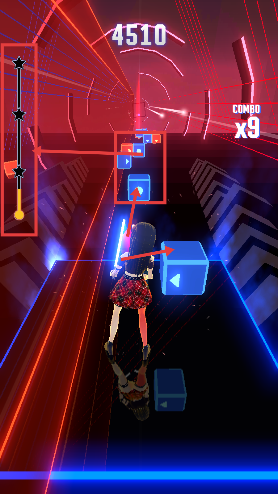 2、挑战中关注【COMBO】连击数,精准击打蓝色方块,积累分数,同时留意左侧星级进度,提升游戏表现。