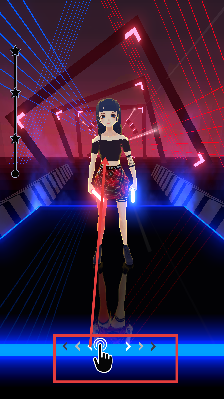 1、进入游戏后,根据提示点击底部方向键,操控角色开始游戏,跟随节奏开启音乐挑战之旅。