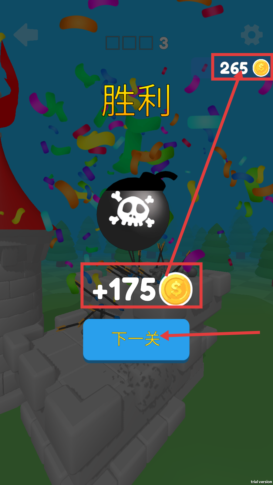 4、通关后可获得金币奖励(如+175-金币),总金币累计(如265-金币),点击【下一关】继续挑战,积累资源升级军队。