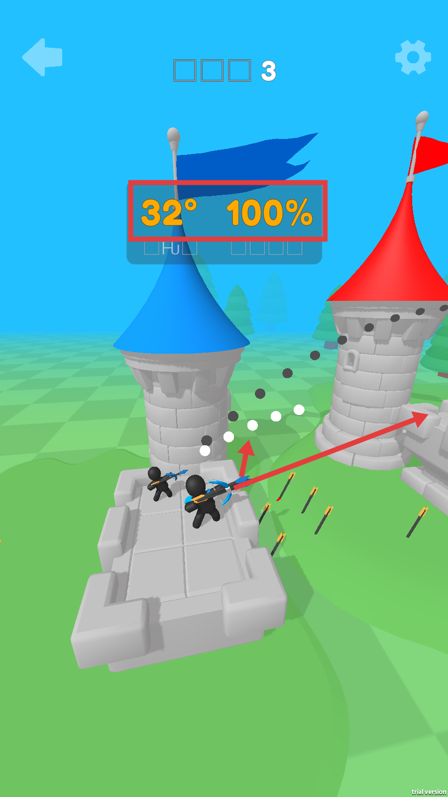 2、攻击敌方城堡时,调整射击角度(如32°),确保攻击命中率(如100%),精准打击敌方建筑。