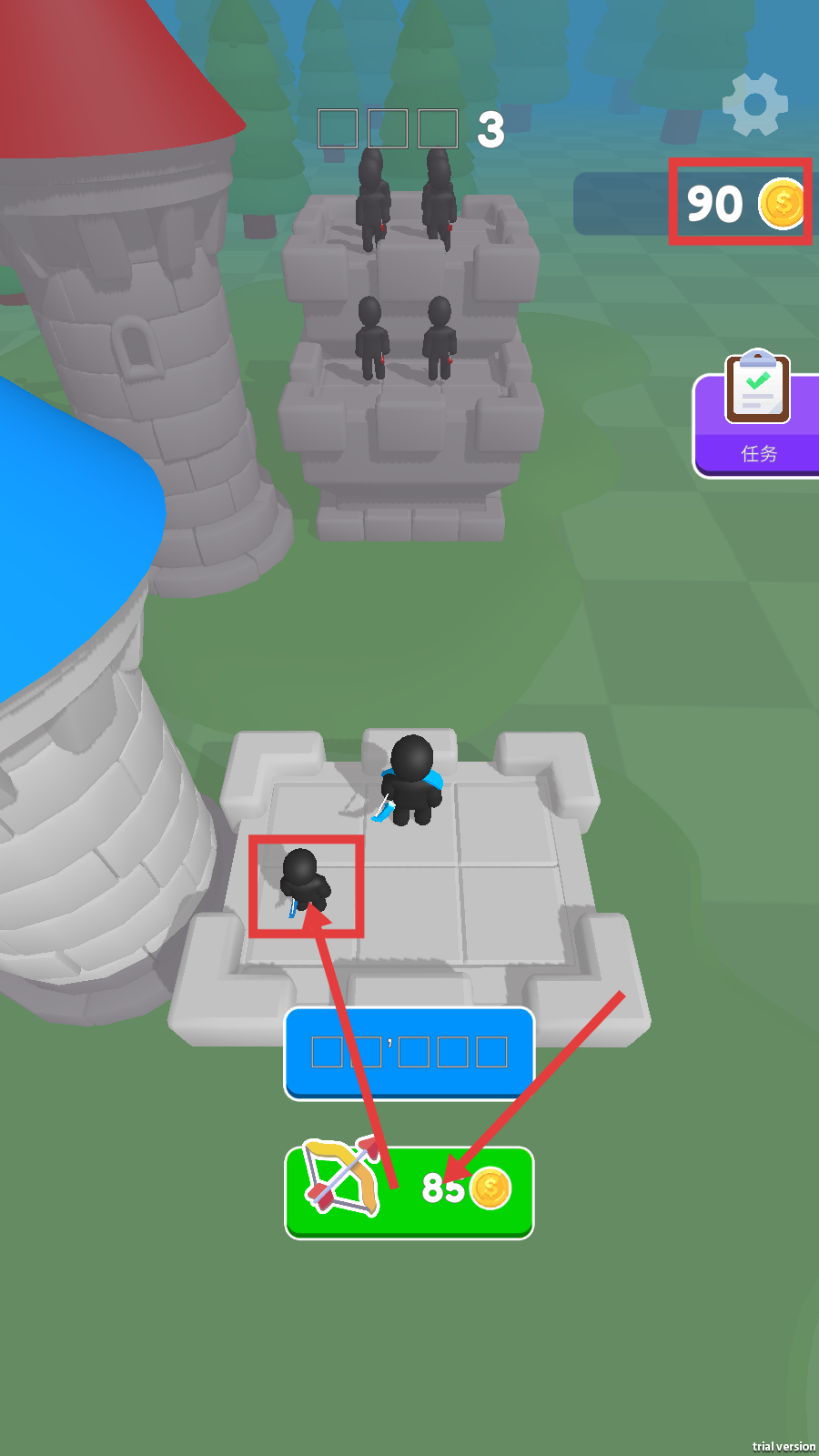 1、游戏开局可花费【85-金币】获取弩兵,提升己方战力,同时留意右上角金币数量(如90金币),合理规划资源。
