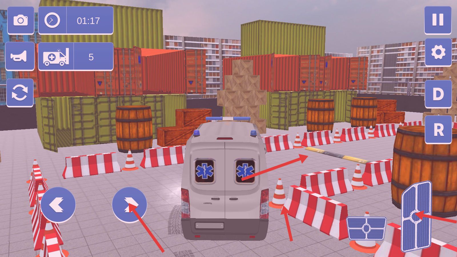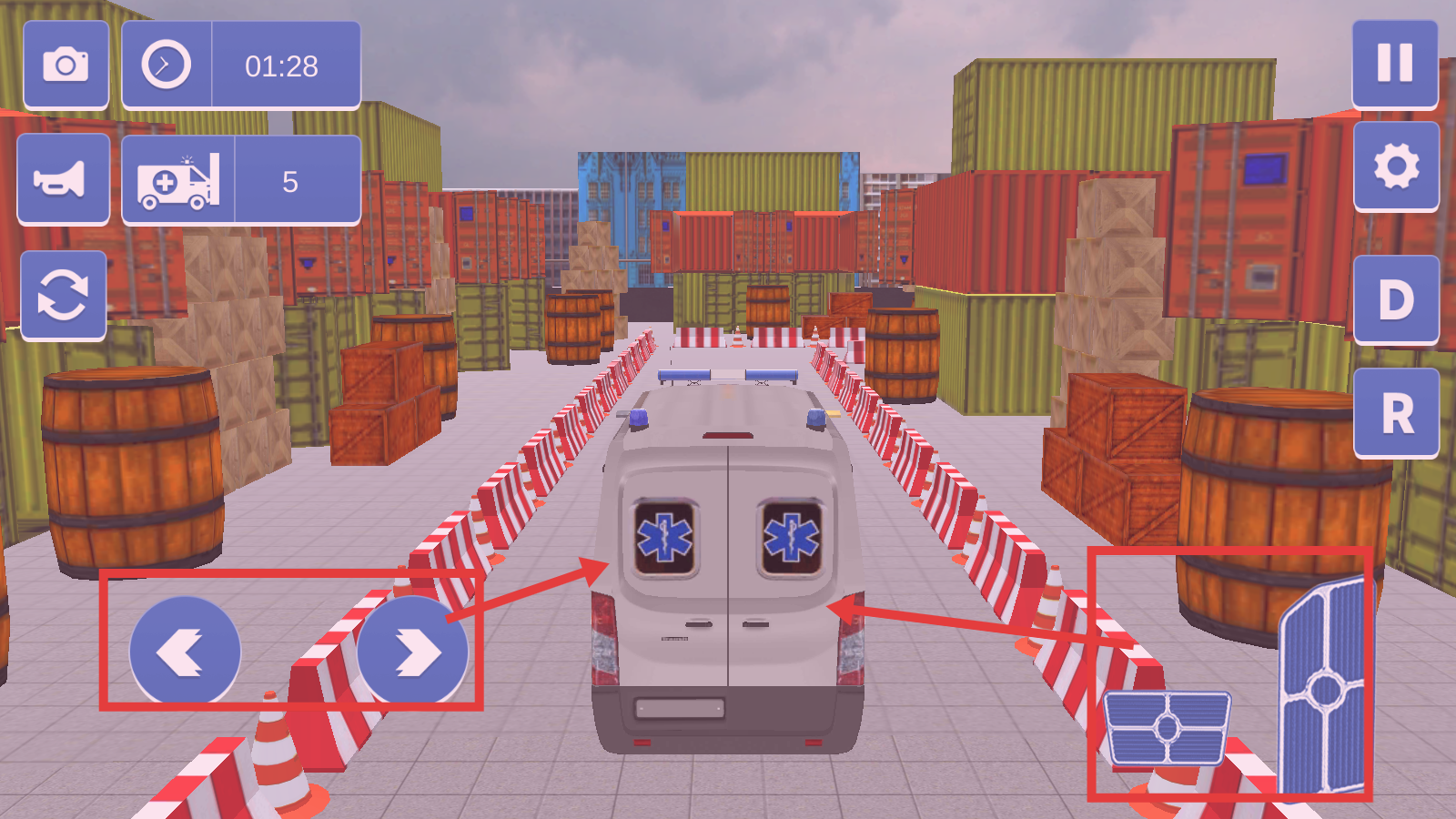 2、驾驶救护车时,用左右方向键调整方向,通过油门键控制车速,在集装箱区域谨慎行驶。