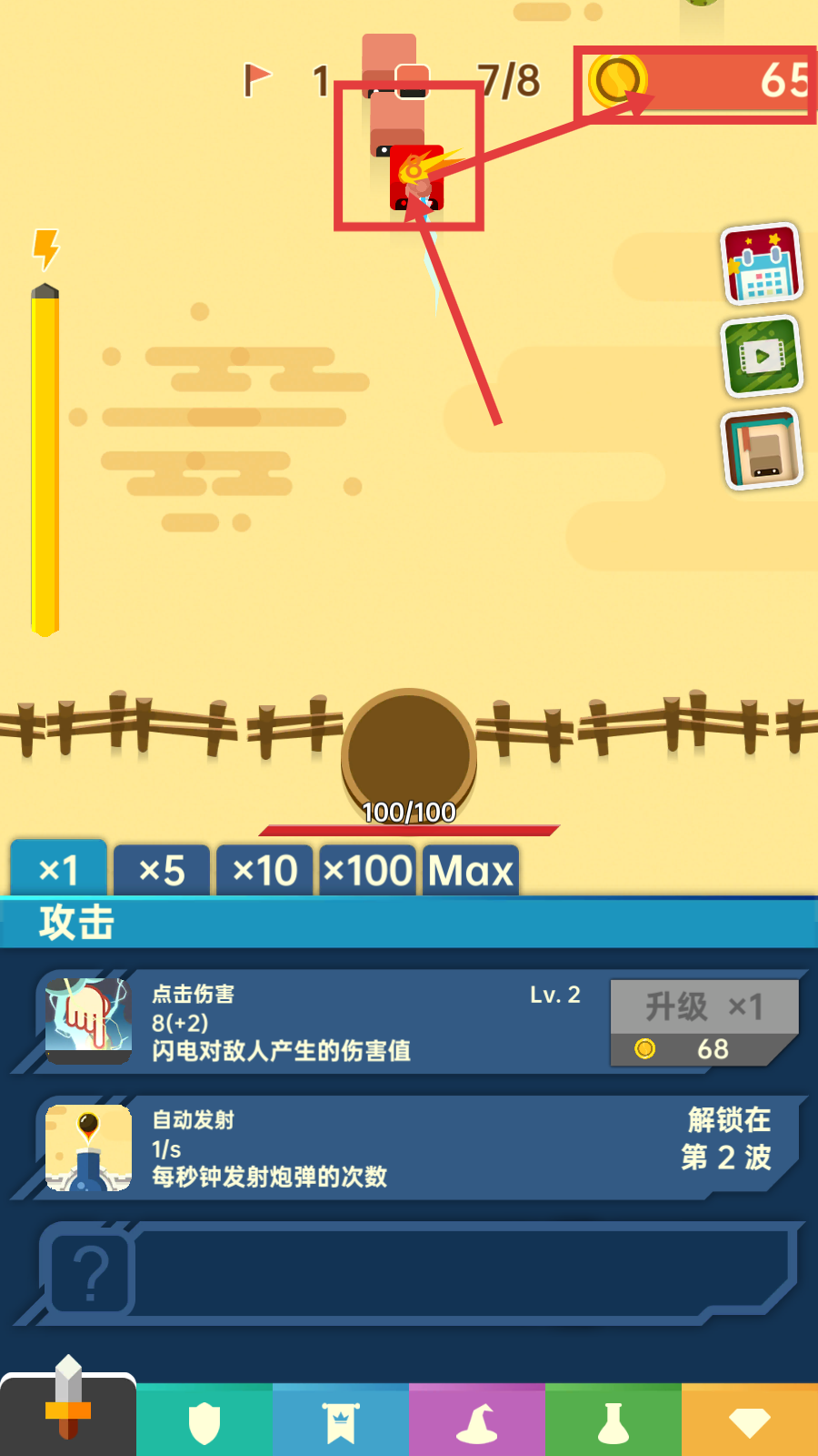 1、攻击敌人获取【金币-65】,积累资源用于后续升级,关注点击伤害的提升。