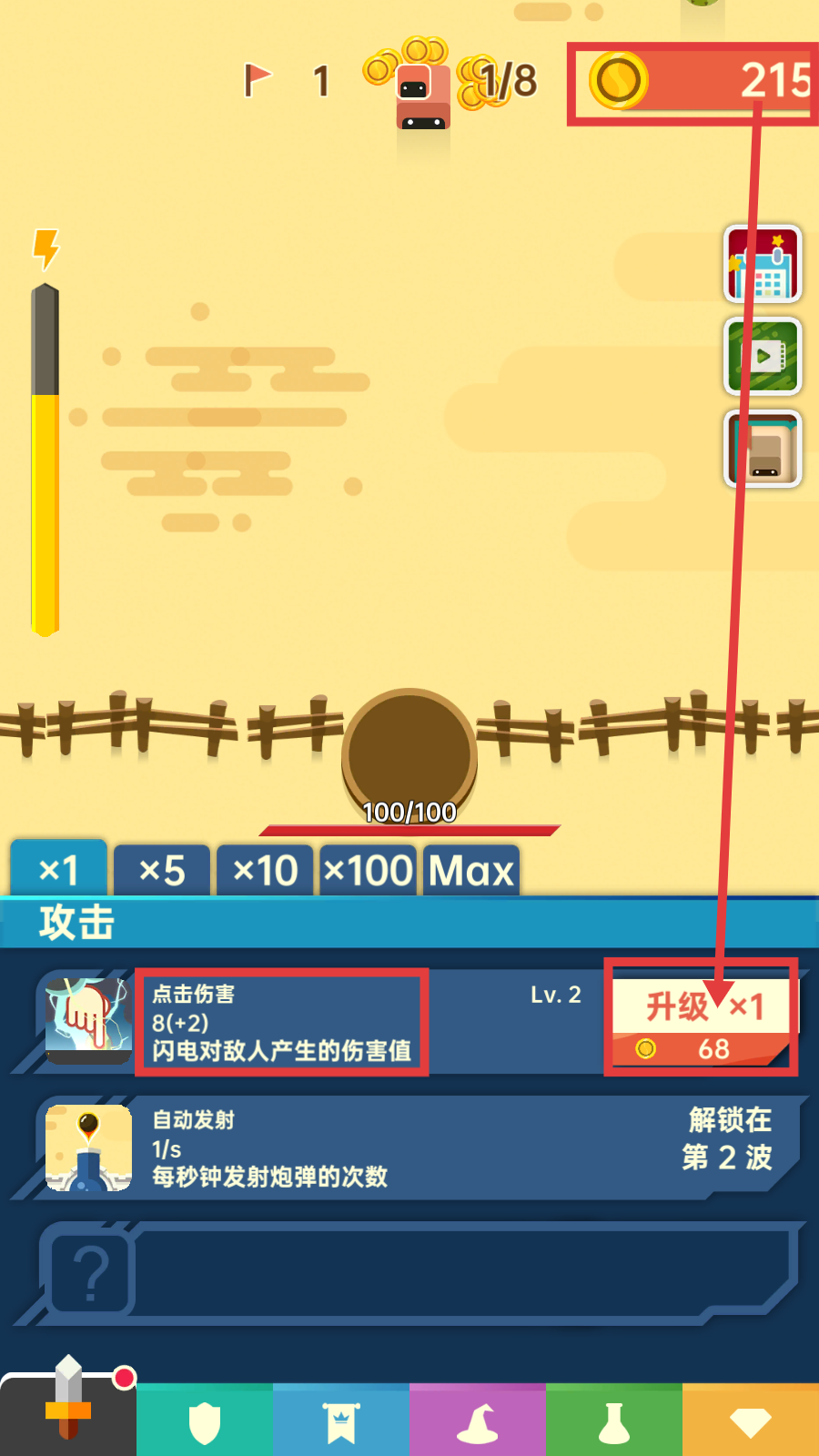 2、消耗【金币-68】升级【点击伤害】,提升闪电对敌人的伤害值,增强战斗能力。