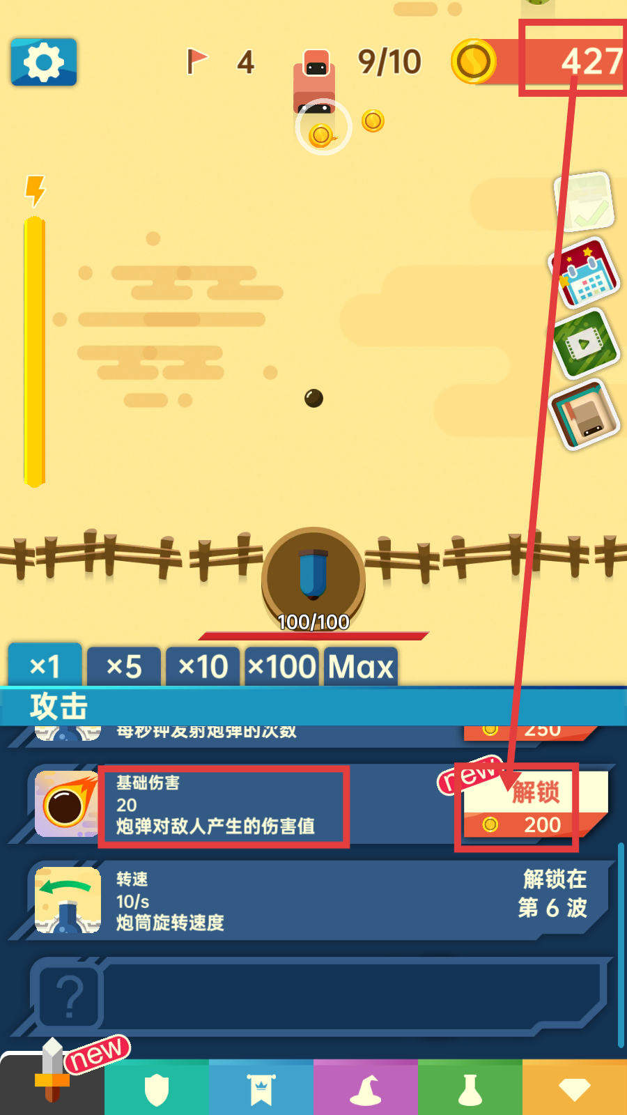 3、消耗【金币-200】解锁【基础伤害】,提升炮弹对敌人的伤害值,拓展攻击手段。