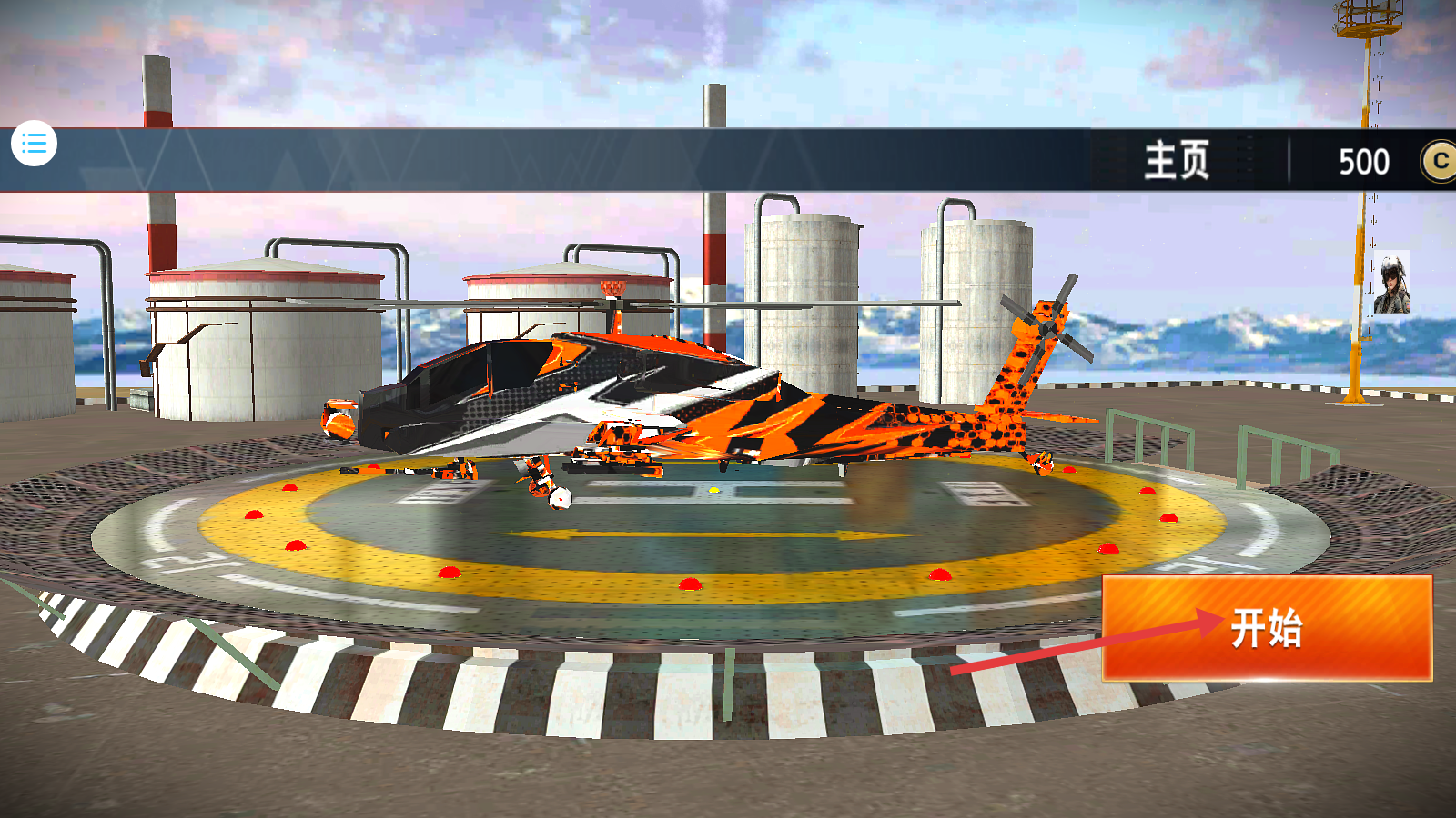 1、点击【开始】按钮进入游戏,初始拥有【金币-500】,准备驾驶直升机开启作战。