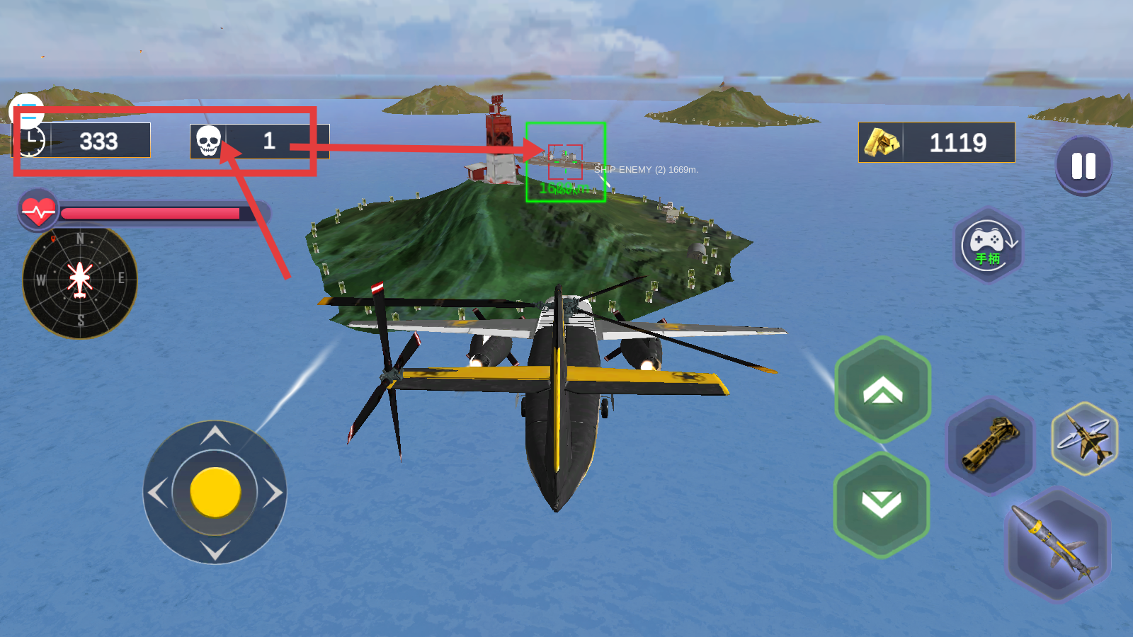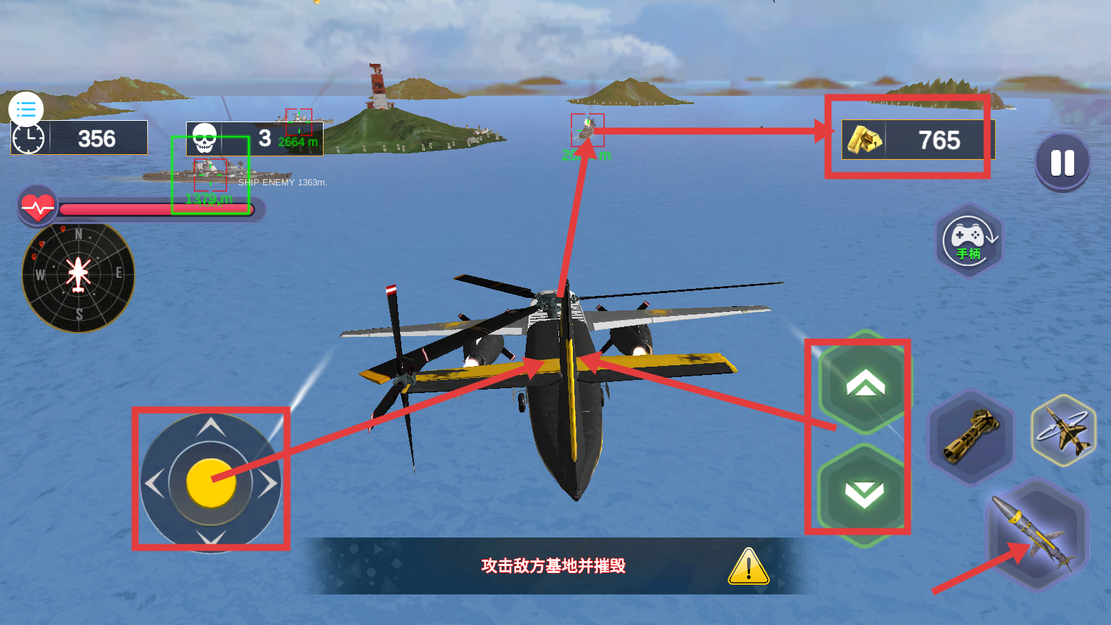 2、利用方向控制和上下按钮操作直升机,发射导弹攻击敌人,积累【金币-765】。