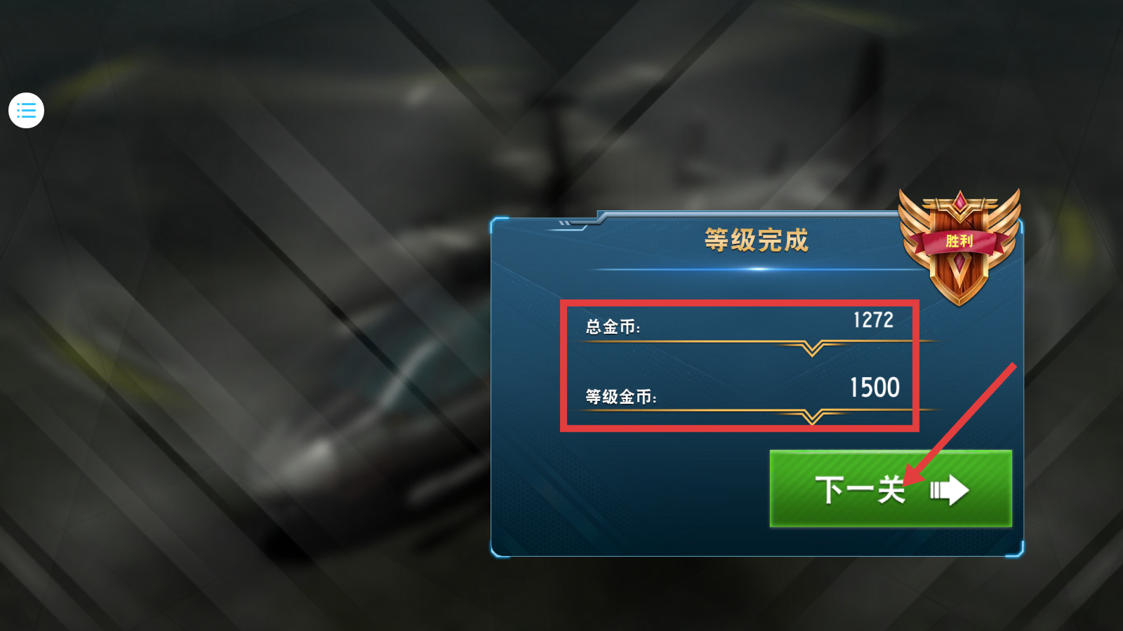 4、完成关卡后获得【总金币-1272】和【等级金币-1500】,点击【下一关】继续挑战。