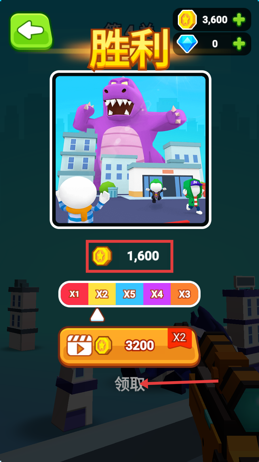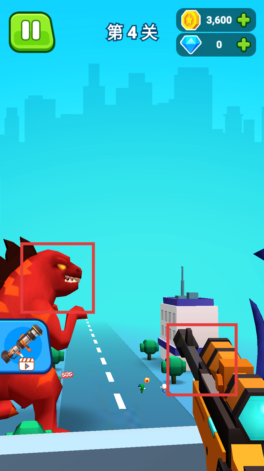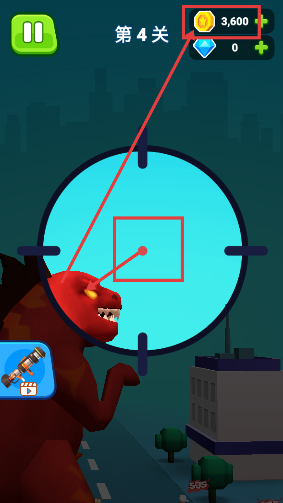 1、第4关操控武器攻击红色怪兽,初始拥有【金币-3,600】,开启怪兽讨伐战。