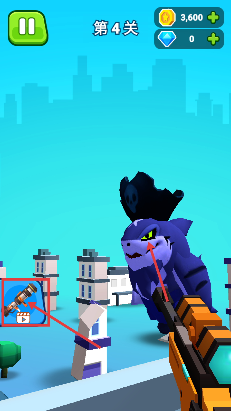 3、挑战蓝色鲨鱼怪兽时,可点击左侧武器图标看广告获取强力武器,助力击败怪兽。