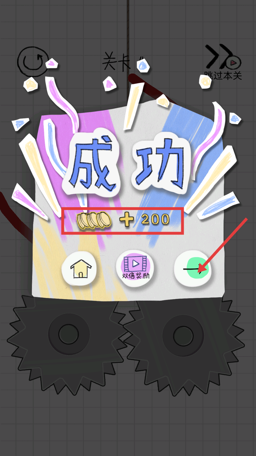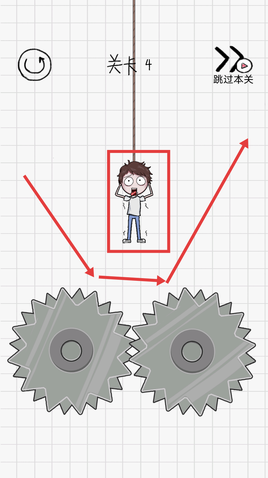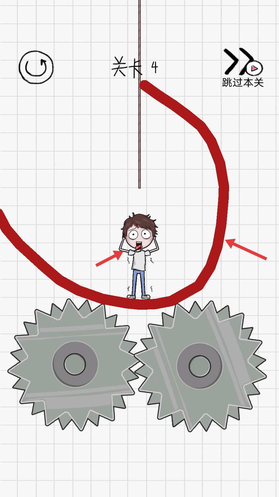 2、在【关卡4】中,面对齿轮和悬挂的人物,需规划画线路径,避免人物落入齿轮,注意【跳过本关】功能可备用。