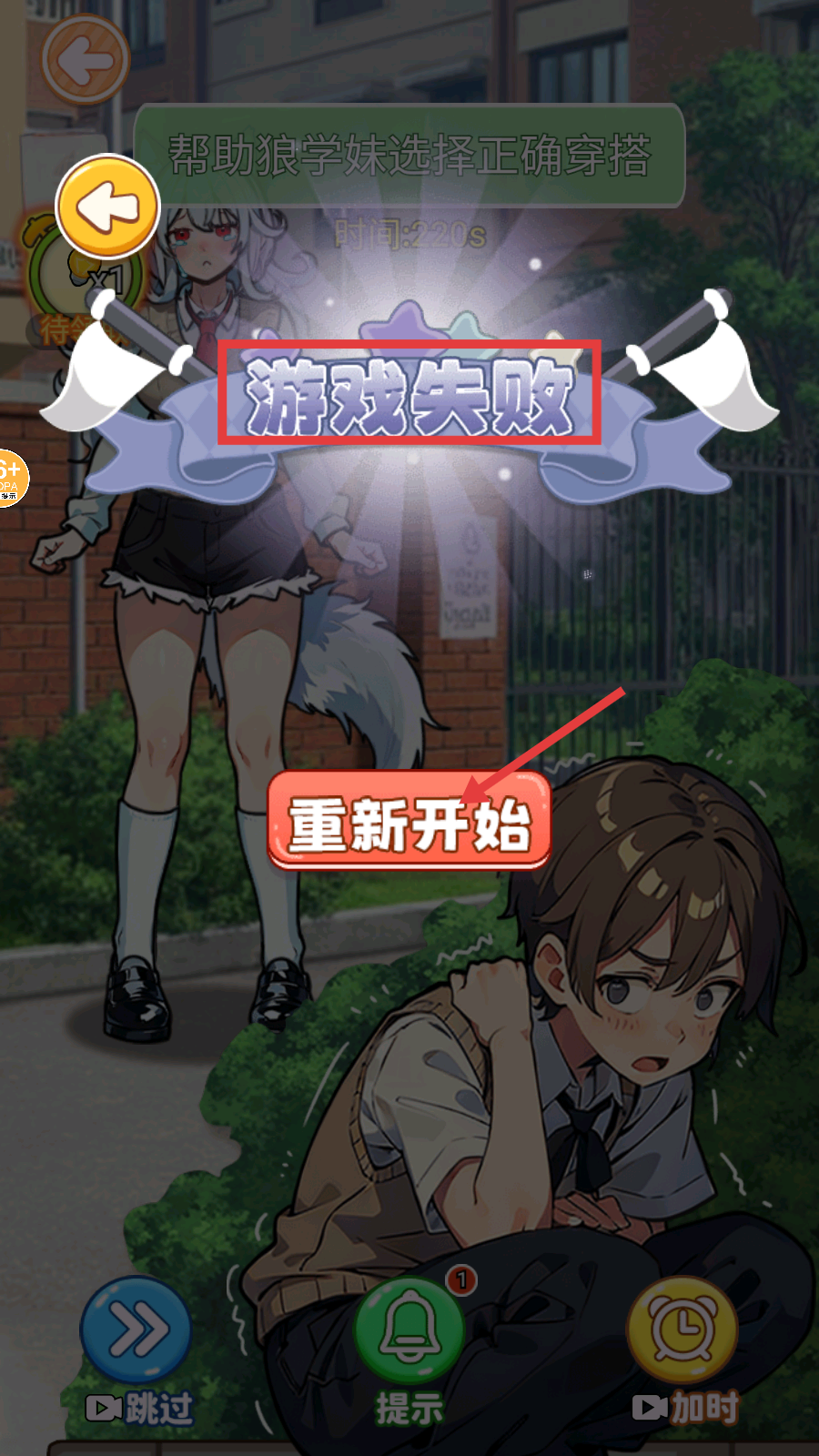 4、若出现【游戏失败】,点击【重新开始】按钮,再次挑战帮狼学妹选择正确穿搭,积累经验避免错误。