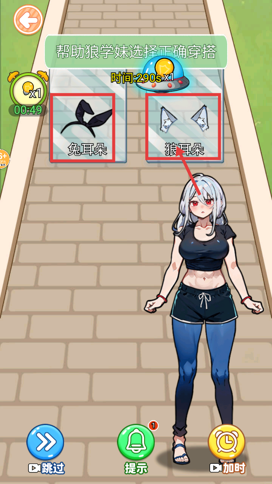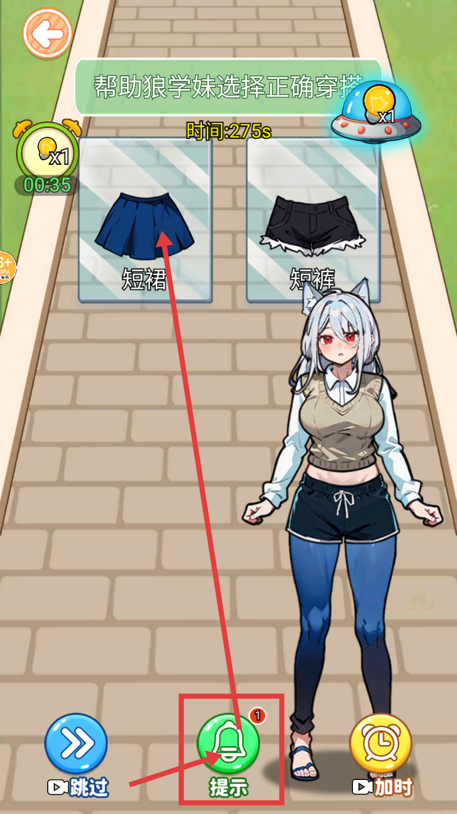 3、遇到穿搭抉择难题时,点击【提示】按钮,获取正确穿搭指引,如选择合适的短裙来搭配。