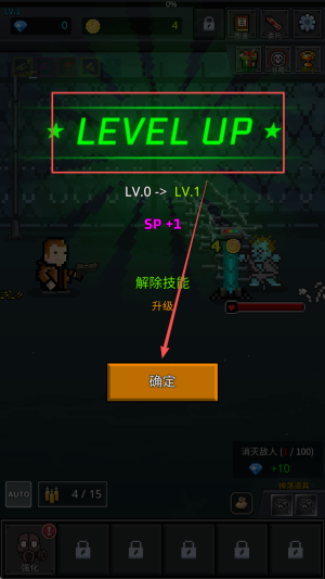 2、如何升级角色:击败敌人后,点击“确定”按钮升级角色,提升能力。