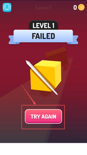 4、如果失败如何重试:如果切割失败,屏幕上会显示“LEVEL FAILED”,此时点击“TRY AGAIN”按钮重新开始当前关卡。