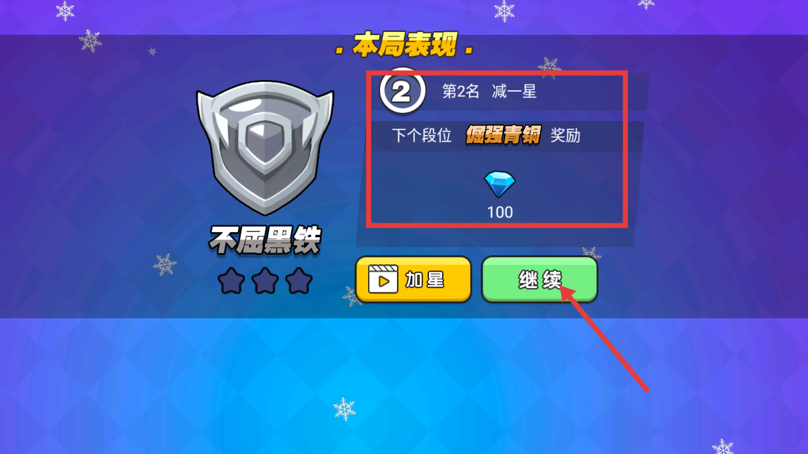 4、对局结束后,根据排名获得奖励,点击【继续】按钮,向【倔强青铜】段位迈进,积累钻石奖励。
