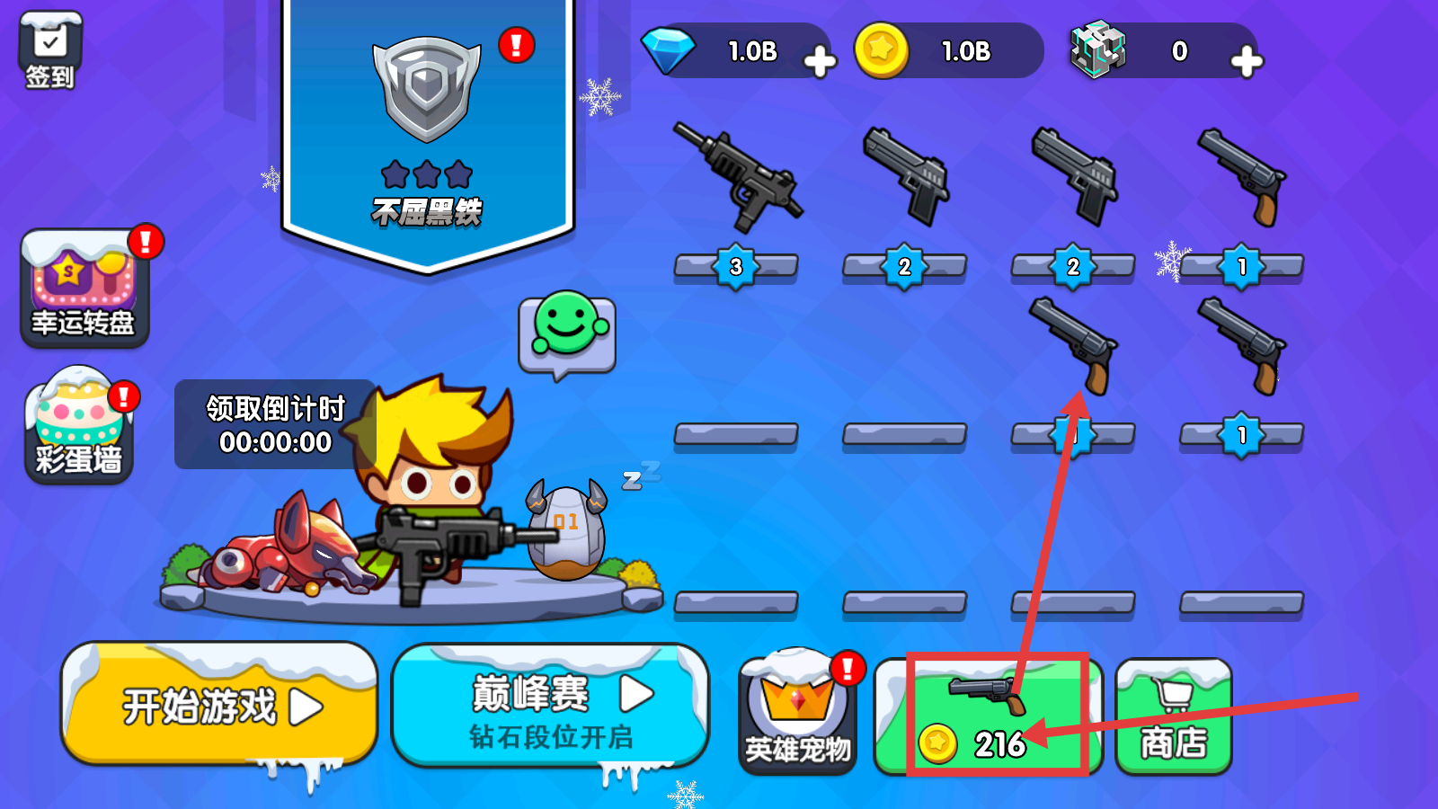 1、点击下方枪支升级区域,花费【金币-216】升级武器,提升战力,为战斗做好准备。