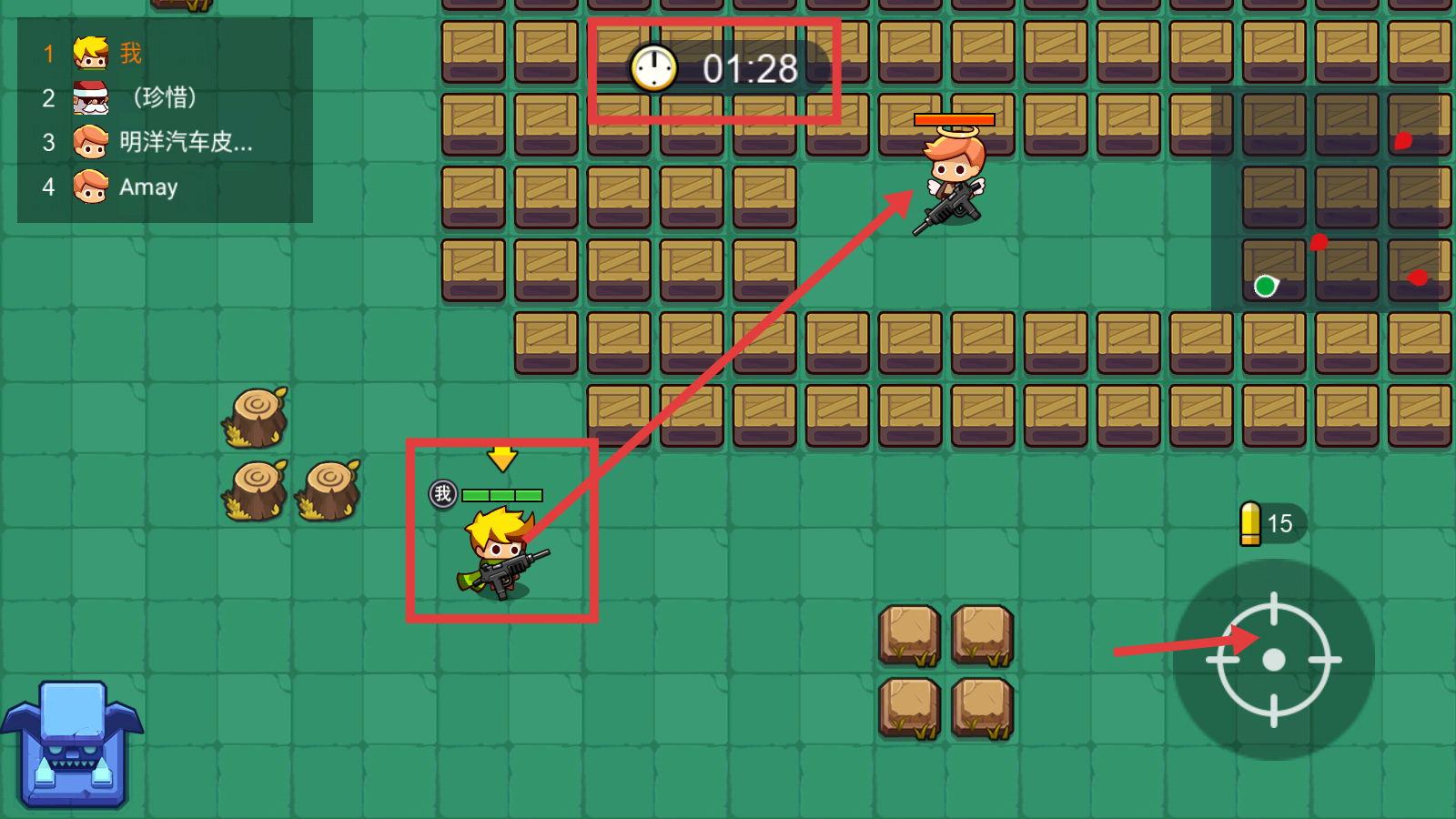 3、对局中使用武器攻击敌人,留意【时间-01:28】,合理走位瞄准,争取胜利。