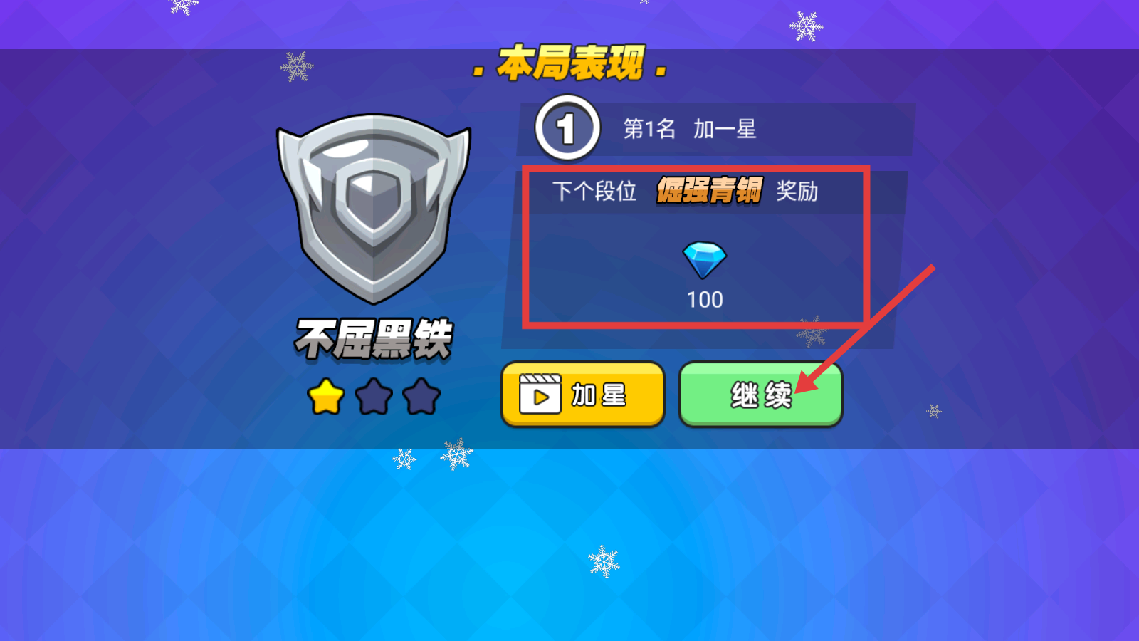 4、对局获第1名加星,点击【继续】,向【倔强青铜】段位迈进,领取【钻石-100】奖励。