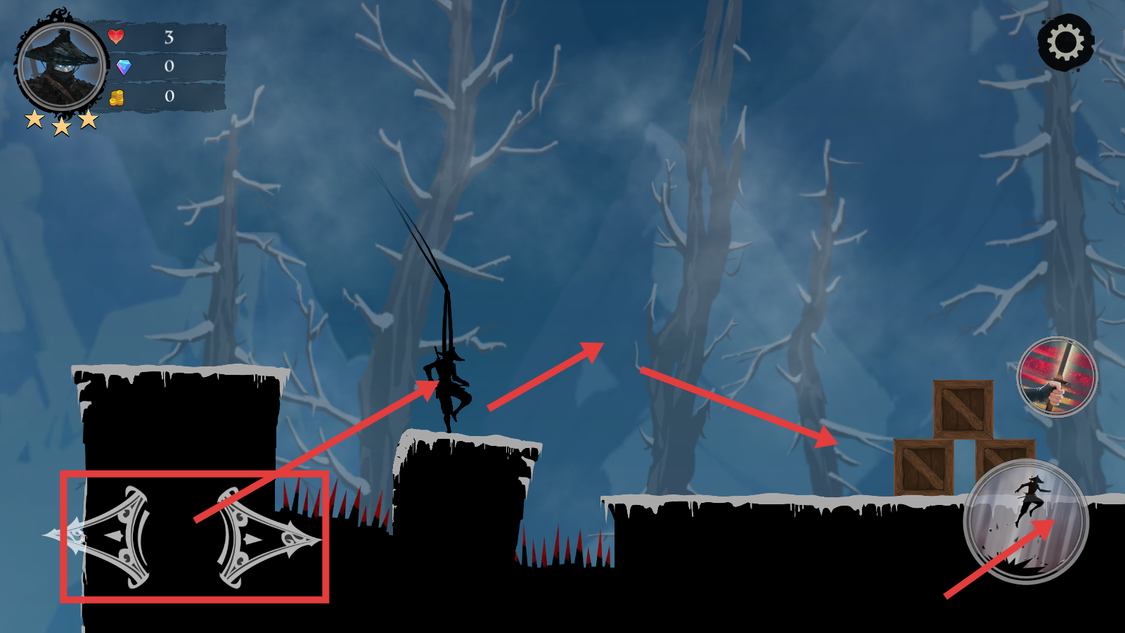 1、利用左侧方向键控制移动,右侧跳跃按钮执行跳跃,掌握节奏跨越地形障碍,避免落入尖刺陷阱。