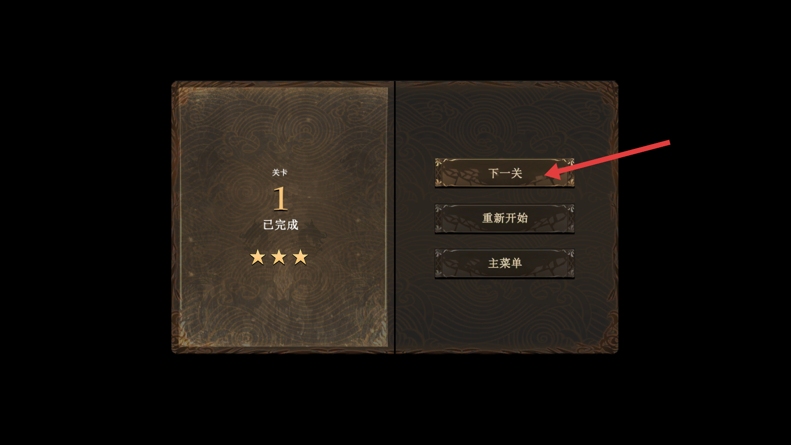 4、关卡1完成后,点击【下一关】按钮继续挑战,积累关卡进度,解锁更多游戏内容。