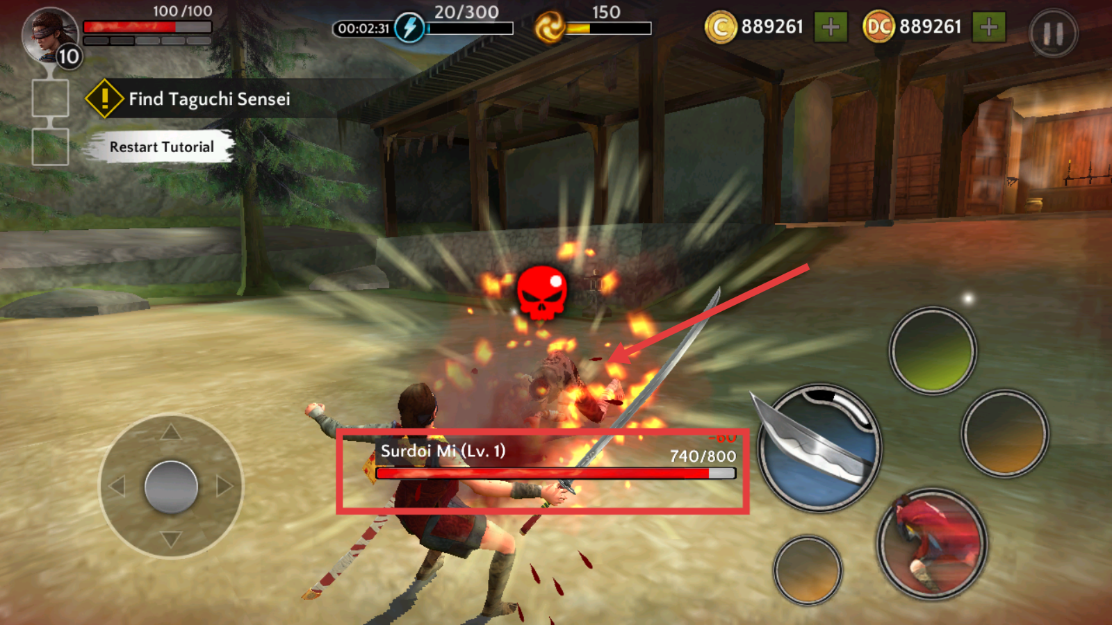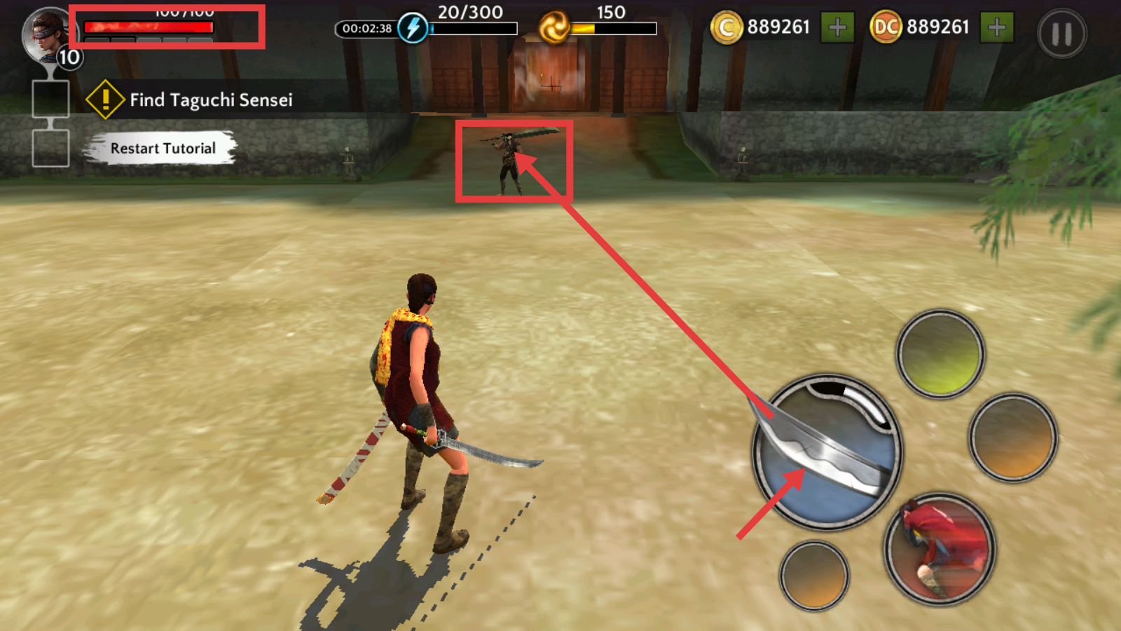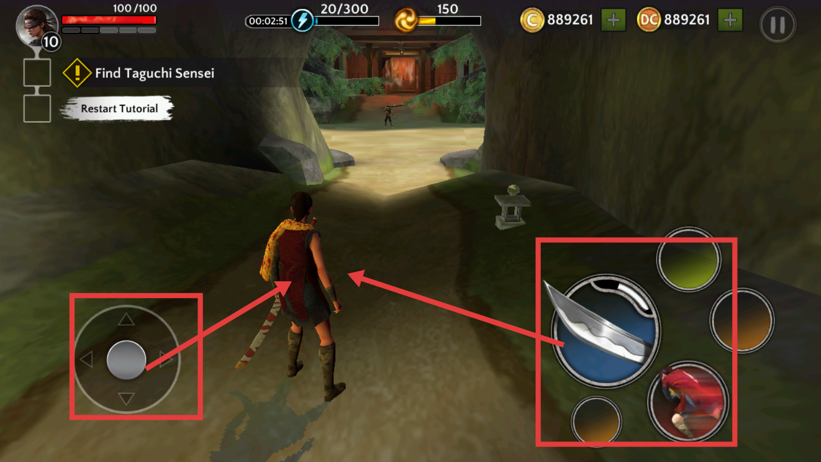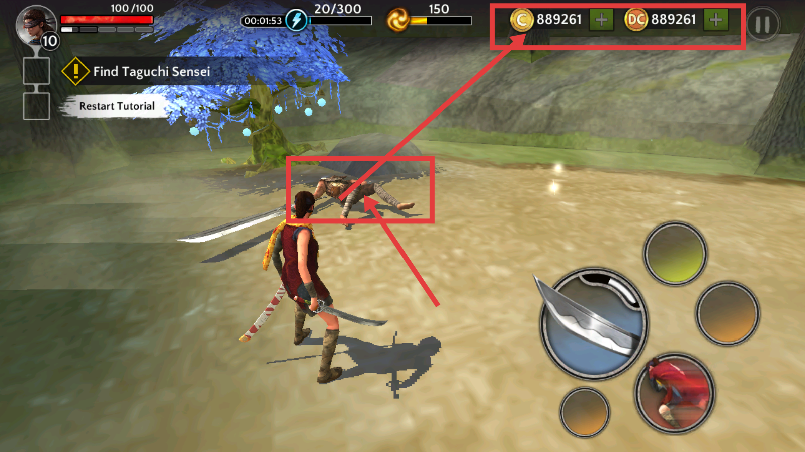 1、通过左侧方向键控制移动,右侧技能键使用武器,执行【Find-Taguchi-Sensei】任务,熟悉操作界面与基础玩法。