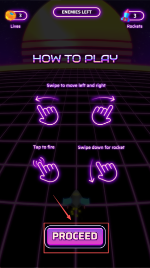 2、接着,在教程界面阅读提示:左右滑动移动,点击开火,下滑放火箭,然后点“PROCEED”继续。