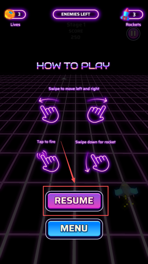 4、最后,若需暂停,点“RESUME”继续或回“MENU”,保持3条命与3发火箭即可冲更高分。