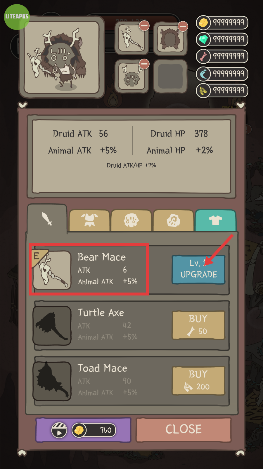 2、升级【Bear-Mace】装备,提升【ATK-6】和【Animal-ATK-+5%】属性,增强战斗力。